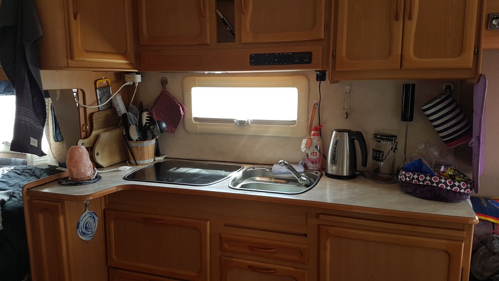 Dessa detaljer såg vi såklart från början, men tycktes vara helt blinda för dem då. Att laga mat som vi gör dagligen, var inte det enklaste. Det fanns dåligt med avställningsyta, och även om spisen hade 4 plattor, så fanns där inget bra utrymme runt omkring. Ingen skärbräda att dra ut heller. Det skulle visa sig att det inte var det allra enklaste att gå från ett ”stort” kök i husvagnen till detta minimala i husbilen….
