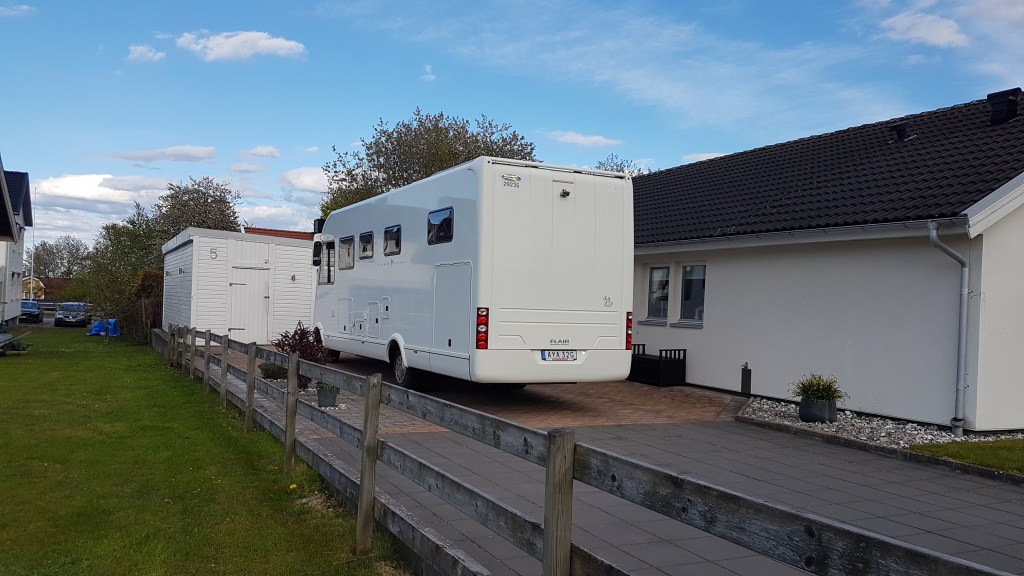 Så alltså blev boplatsen husets uppfart. Vi har inte kopplat in ström, batterierna var fulladdade efter resan hit och gårdagen bjöd på strålande sol. Totalt 2 nätter, och för allra första gången står vi på stenbeläggning.