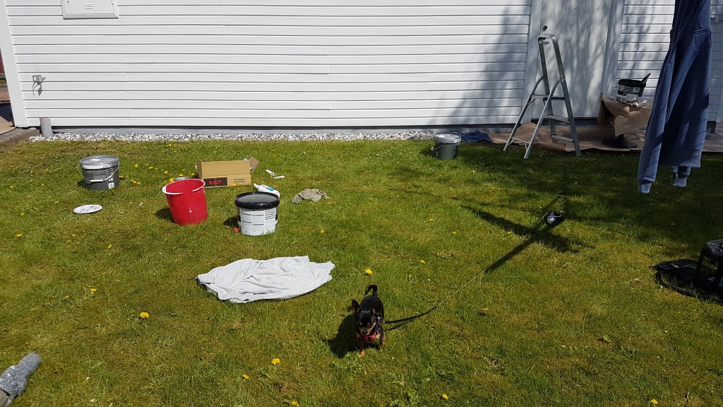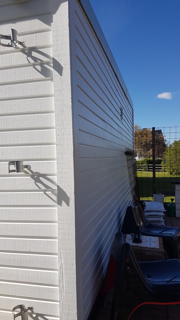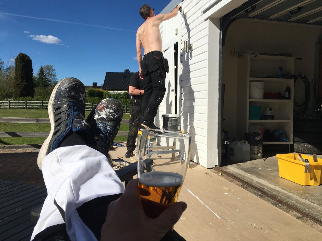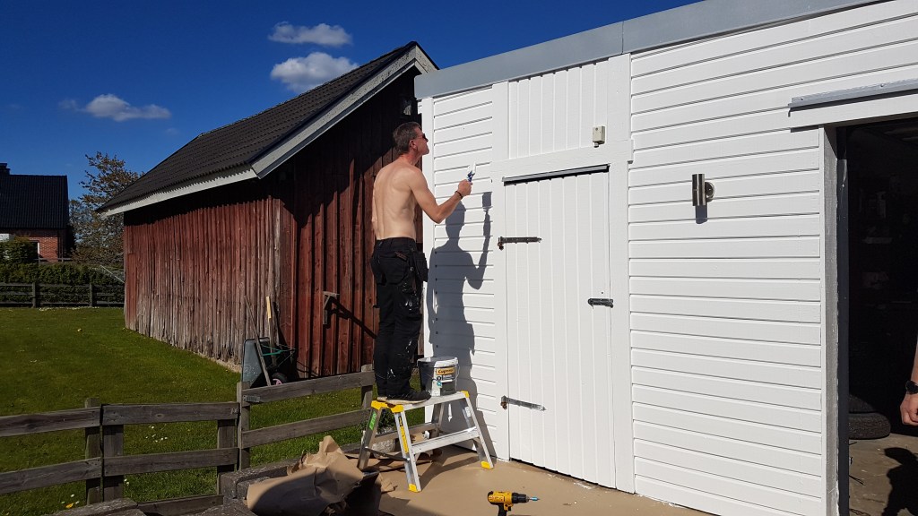 Kristi himmelfärds dag och jobbdag för Ritzén. I onsdags tog vi vårt pick och pack och åkte till Skillingaryd på målarjobb. Vi tog ”firmabilen”. 😂 Vi skulle måla ett garage och underslag och vindskivor på huset. Tack vare Nisse, kunde vi åka upp dagen innan och parkera på uppfarten. Bilen ser lite malplacerad ut, men står jämt och fint och får lätt plats.