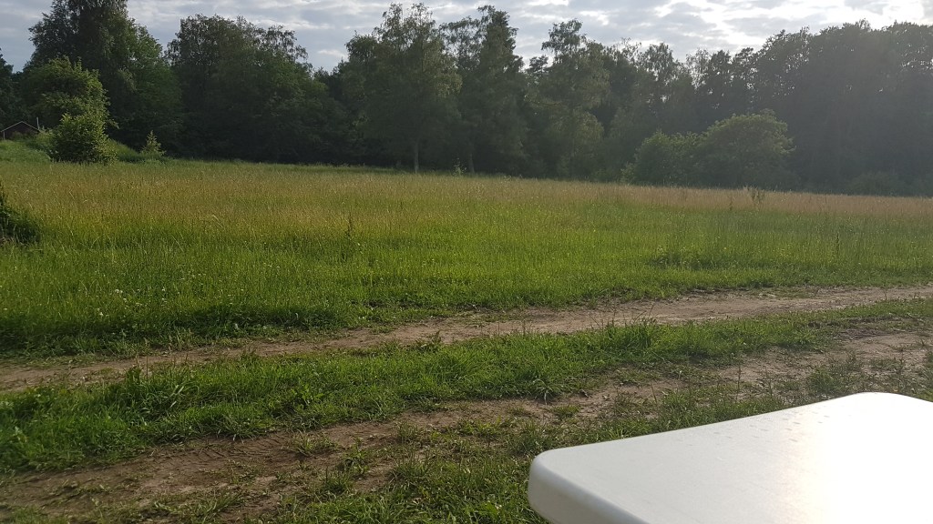 Ja, själva utsikten från husbilen är väl inte mycket att skryta med. En åker. Och vi står precis intill vägen där man har placerat ut blomkrukor för att hålla ner hastigheten. Men här är väldigt tyst och lugnt. Mest fågelkvitter och en och annan hare. Vägen är vältrafikerad av promenerande människor med eller utan hundar, cyklister, inlines-åkare och en och annan bil, traktor eller fyrhjuling.
