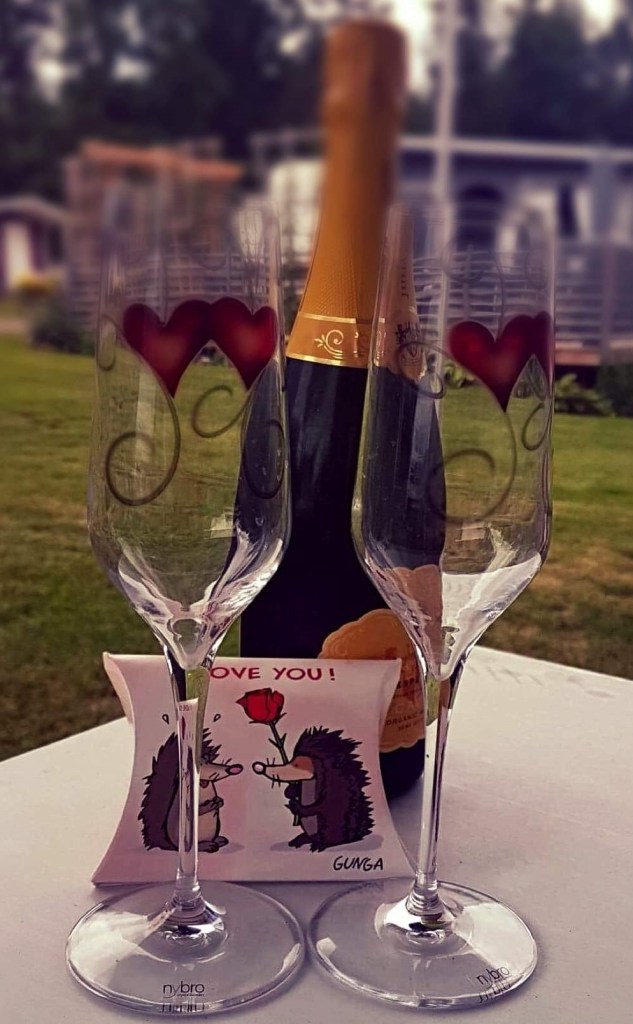 Champange-glasen på bilden är en bröllopsgåva som vi valt att ta med i bilen som de enda riktiga glasen, alltså inte plast. Dessa plockas fram vid lite speciella tillfällen när vi tycker att vi vill fira något lite extra.
