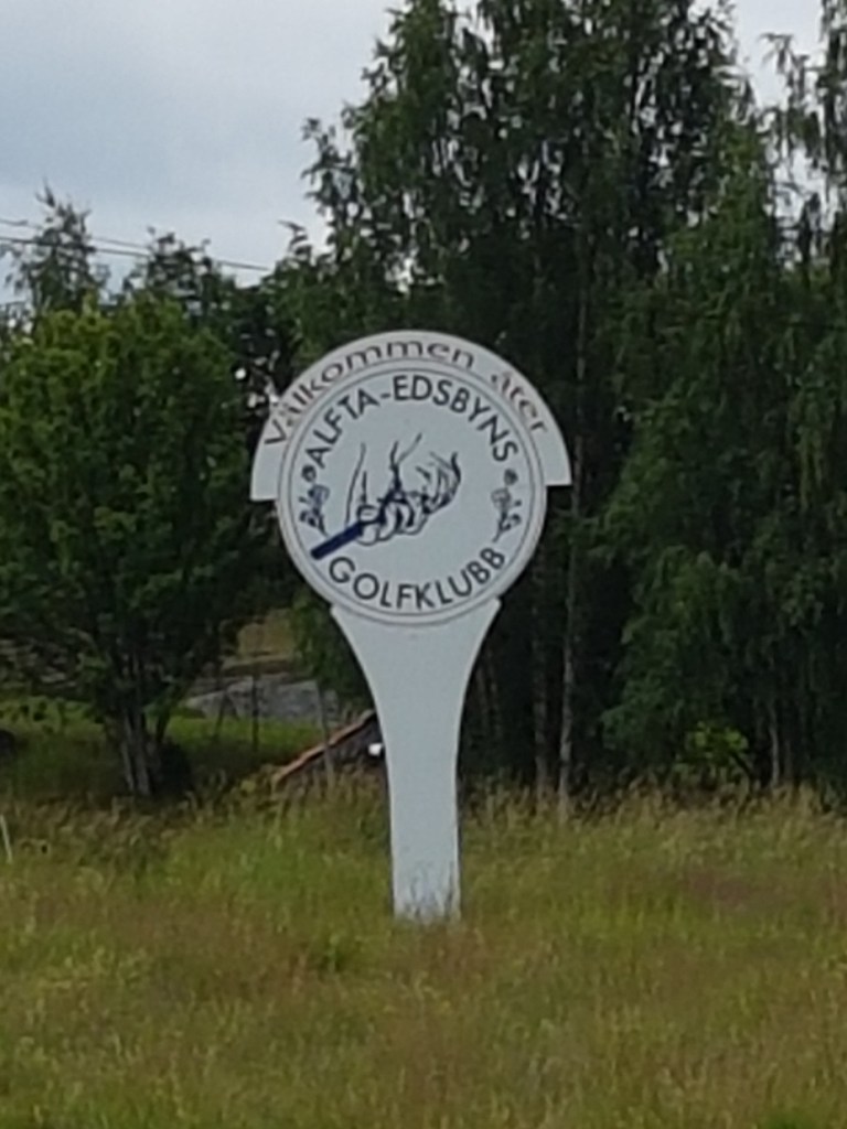 Alfta-Edsbyns GK visade sig vara en mindre klubb som inte gick att boka starttid hos. Men vi åkte in ändå. Vi fick gärna parkera hos dem, antingen bakom servicehusen med el, eller om vi ville stå kvar på parkeringen en bit från klubbhuset. Vi valde att stå på grus precis utmed banan för att slippa köra över deras rabatter och annan trädgård med klumpen Nisse…