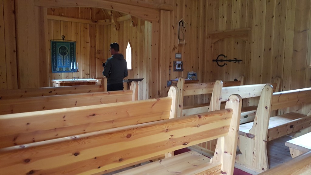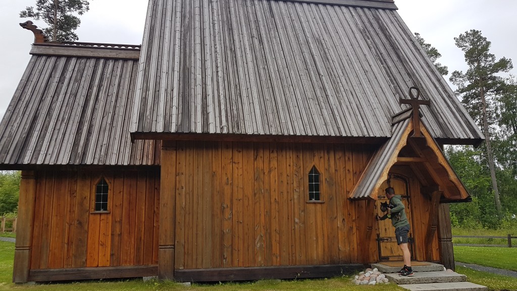 Vi åkte från Sollefteå till en liten by som hette Lillsjöhögen. Vi hittade en plats utmed vattnet även där, en liten sjö. Dock stod vi på en parkering över natten med närhet till villorna i området. Fast det regnade hela eftermiddagen så någon utflykt runtomkring blev det aldrig. Men vi stod skyddat och kunde ha markisen ute även över natten. Tyvärr sjönk temperaturen rejält mot tidigare dagar och planerna på nästa golfrunda lades på is. Men vi tog en titt på byns hemmagjorda kyrka, Stavkyrkan, innan vi styrde vidare.