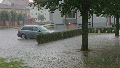 Just nu, efter semestern såklart, är det fantastiskt väder här hos oss. Och det har varat några dagar nu. Men veckan började med översvämningar i Ljungby, med skyfall och hagel. För de boende i staden blev det blötare än på mycket länge (även fler platser blev drabbade). Vattnet forsade på gator och ner i källare. Personligen såg jag inte detta, men Dan fick jobba över och hjälpa vaktmästarna med att pumpa vatten från flertalet källare. Bilden har Dan tagit efter regnet.