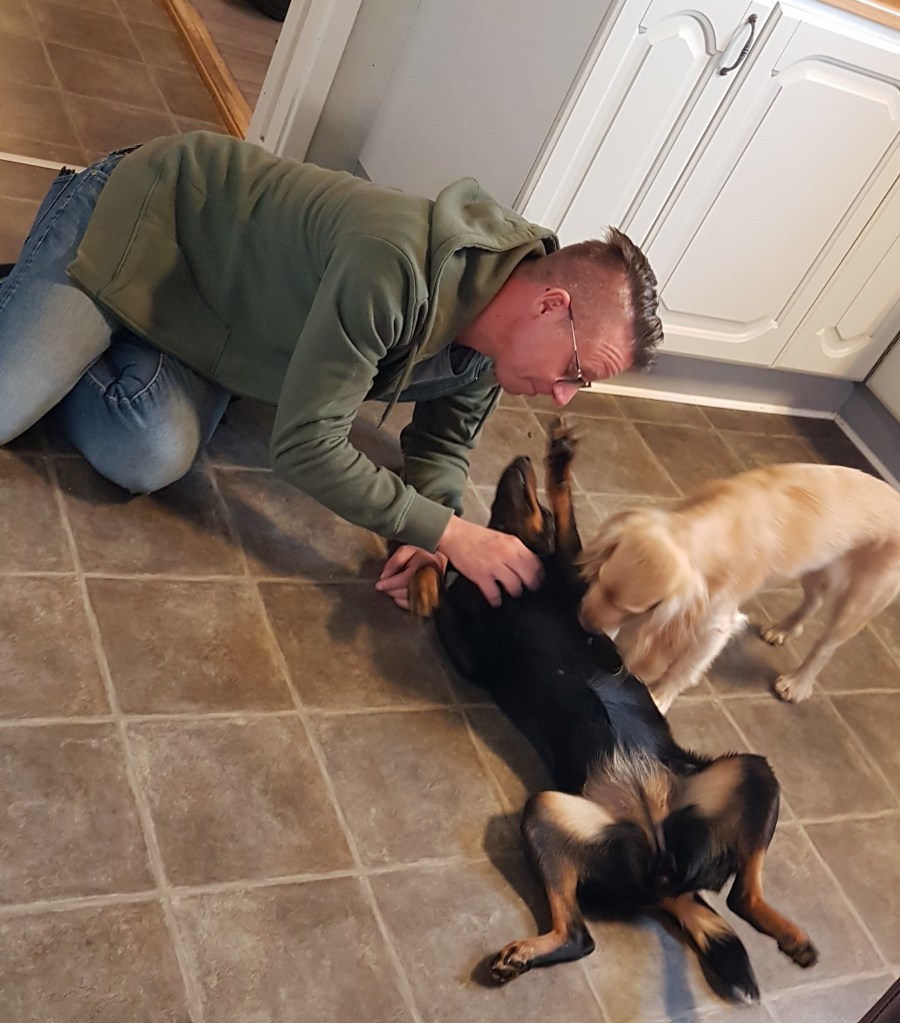 Än står vi kvar på landet, på vår ”postlådeadress”. Vi är ju just nu beroende av ström om vi vill kunna kyla maten. Dan passar på att kela med hundarna: //Jeanette