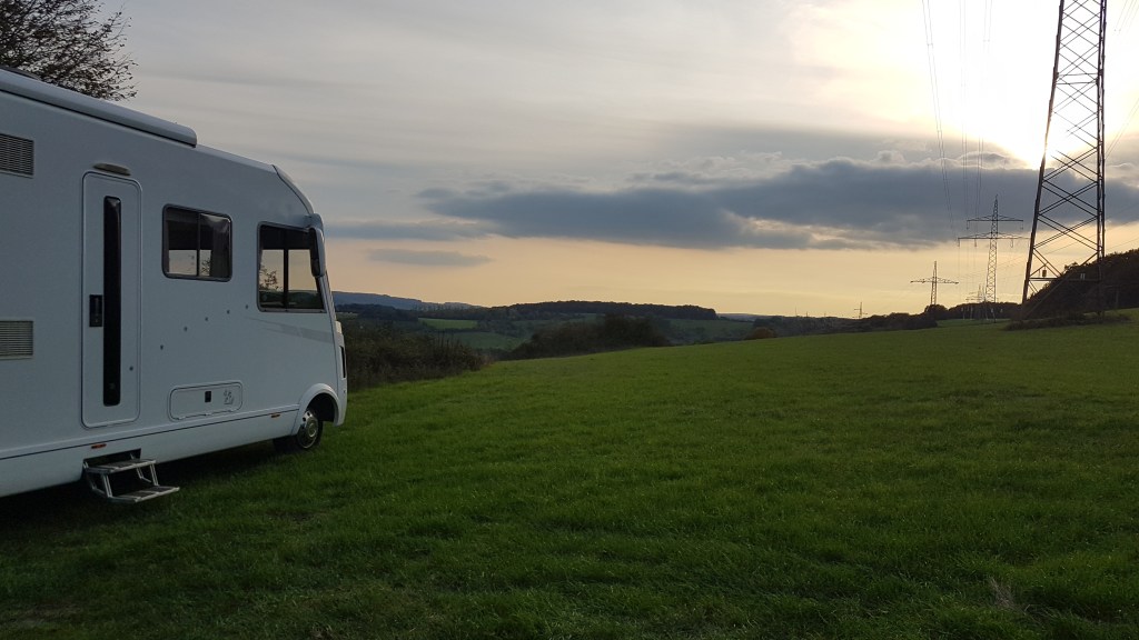 I morse, när vi för övrigt hade lämnat Tyskland och landat strax innanför gränsen till Luxemburg, funkade batterierna som vanligt. Pannan hade varit på under natten, ingenting annat. Vi provade att ladda våra datorer, och jag skulle jobba ett par timmar var tänkt. Men det blev bara så en kort stund. Det kom en skogsvaktmästare och körde bort oss… från denna fina plats.