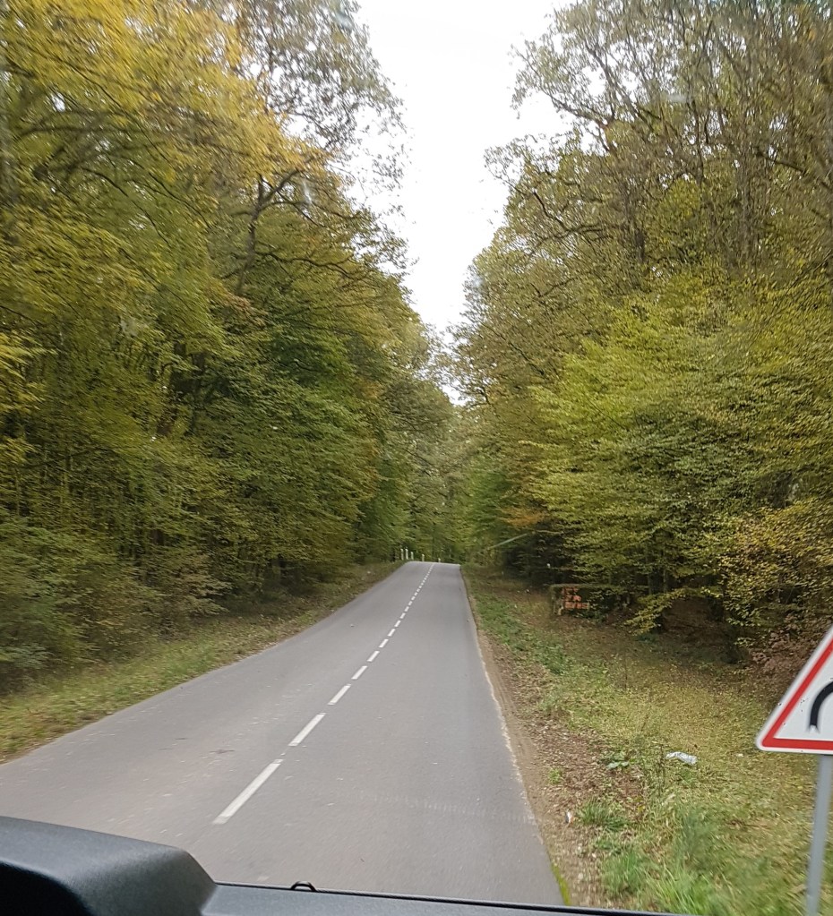 Vi bestämde att åka på en gång, stanna så fort vi kommit in i Frankrike. Det tog drygt 30 minuter att köra igenom Luxemburg, ingen gränskontroll någonstans. Bara att åka. Vi letade upp en parkering och slog läger för lunch och lite jobb. Återigen hittade vi en fin liten väg med bokskog.