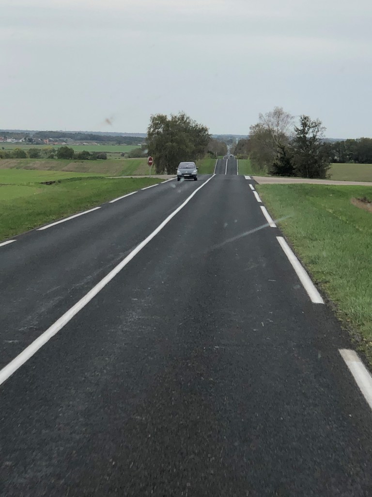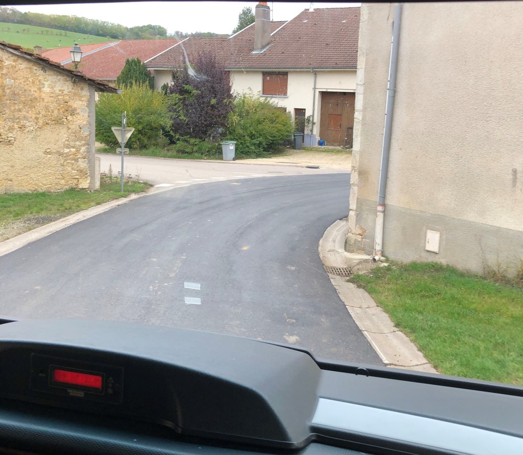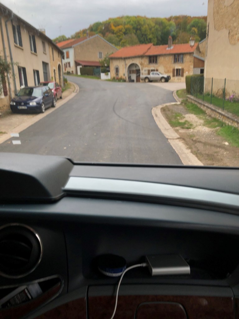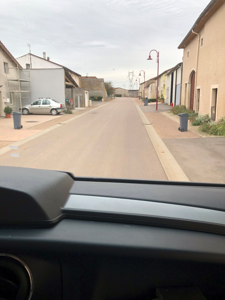 Tillslut kom vi fram till ett samhälle, Châtenois, efter massor av krokiga små vägar genom Franska landsbygden. Vi mötte traktorer och blev förföljda av lastbil på dessa minimala vägar. Och fick se mängder med åkrar, enorma åkrar. Och en hel del mindre byar, som såg ganska risiga ut allihopa.