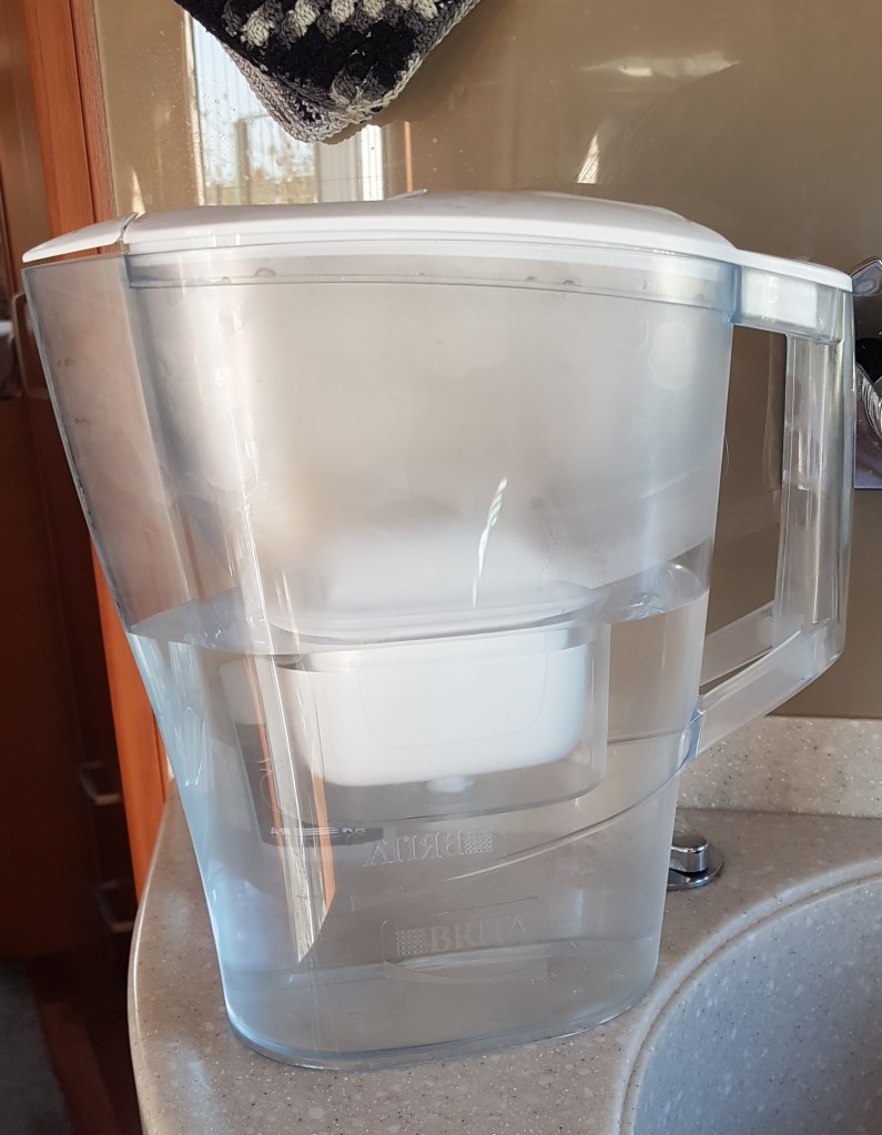 Brita är en vattenkanna med filter som renar vattnet åt oss. Med mätare som berättar när filtret behöver bytas ut. Att dricka vattnet smakar exakt ingenting. Inte gott, inte äckligt. Vi fyllde tanken i Tyskland, på Niesmann-fabriken. Och det vattnet smakade klor, vart inte så gott att dricka. Men detta som filtrerats genom Brita, det funkar fint.