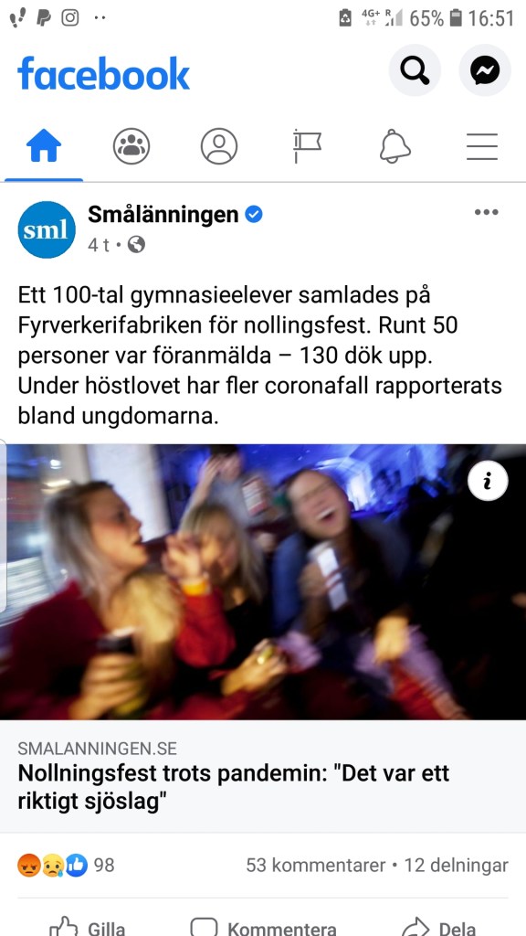 Valencia som regionen vi bor i heter, är den region i Spanien som har minst smittspridning just nu, lite mindre än Stockholm om man nu vill jämföra. Regionen söder om oss däremot, Murcia, där är det andra regler nu. Inreseförbud och förbud att åka mellan kommunerna utan giltigt skäl till exempel. Så det blir inget mer åkande för vår del, vi står bra där vi står tills vidare. Bilden visar ett klipp från min facebook idag, som berör just Ljungby. Inga fler kommentarer på den. // Jeanette