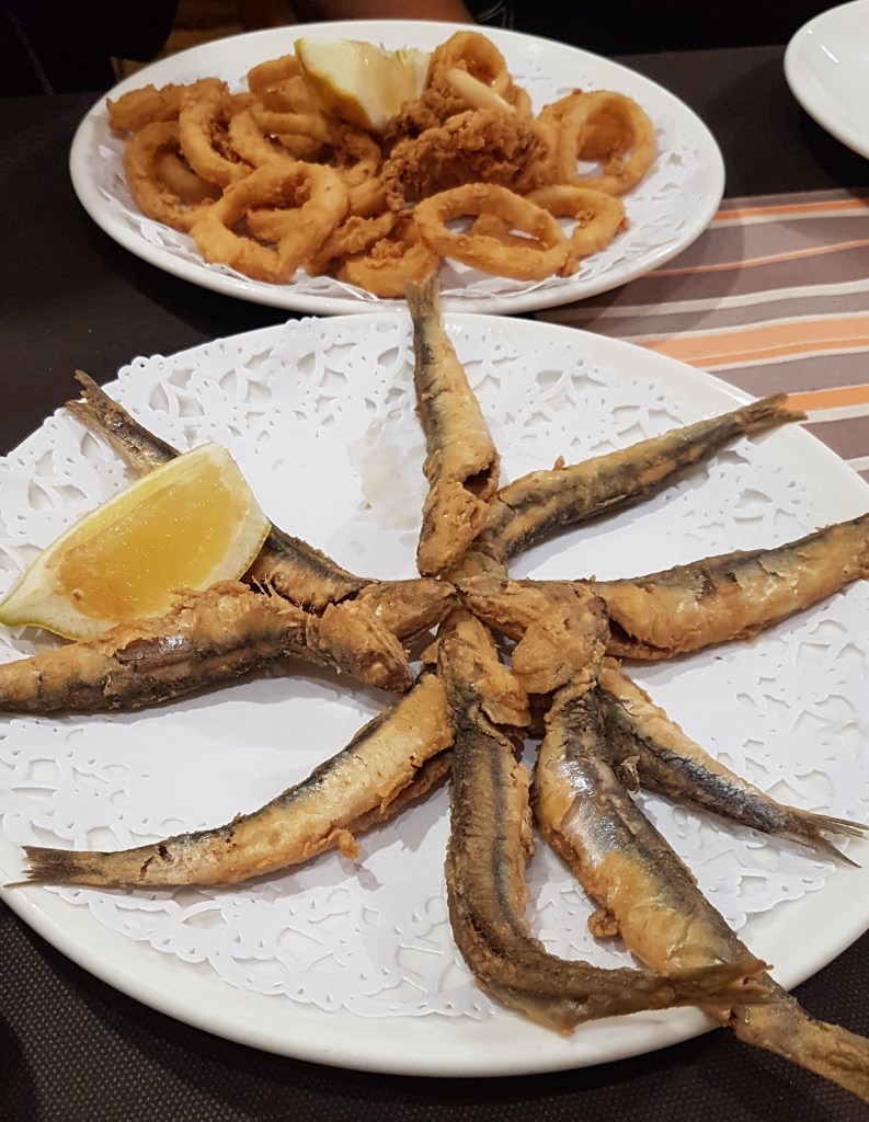 Maten vi beställde bestod i ett antal (5 st) smårätter följt av varmrätt i form av Paella och sedan efterrätt bestående av tre kulor glass, med grädde och två olika rån. Mycket mat blev det. Men ganska billigt tyckte vi, 16 € per person. Den översta bilden visar 2 av förrätterna, och den understa resten av paellan som jag inte kom på att fota förrän vi käkat klart…