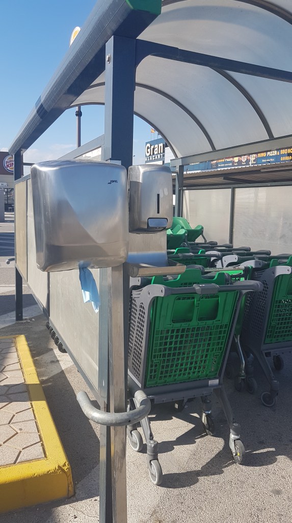 Häst och ryttare gjorda av hästskor står utanför Mercadona, mataffären vi handlar på ibland i närliggande byn el Gran Alacant. Här är man mycket noga med hygienen, som på de flesta andra ställen här. Handsprit vid kundvagnarna utomhus, vid ingången och utgången.