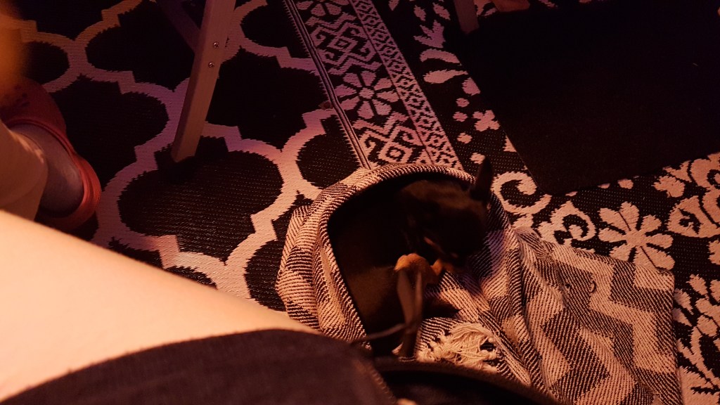 Vi har i alla fall lärt oss spela detta nu enligt reglerna, och vidare med egna påhittade regler som inte står i manualen… Hur som helst var det riktigt roligt, för oss som inte har något julstök att ta hänsyn till. Lite tröttsamt, tyckte Chillie, som buffade in sig i filten och somnade.