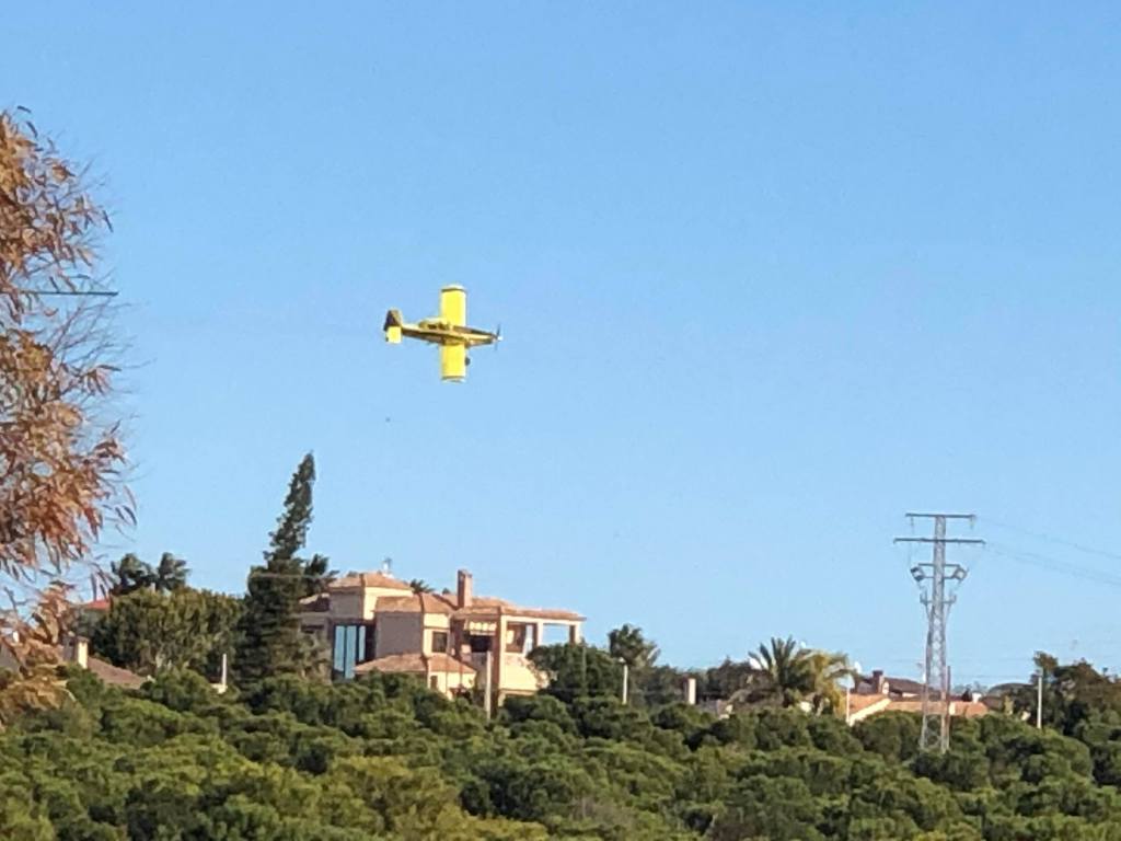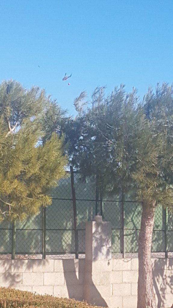 Efter de första brandbilarna kom flera, och under tiden vi gick tillbaka tutade det friskt från alla håll. Väl tillbaka på campingen, efter kanske 30 minuter hade man skickat upp flyg. Sen gick det fort. Folk på campingen gick ut och tittade, helikopter och flyg åkte i skytteltrafik med vatten och bombade för fullt. Campingägarna tittade, men konstaterade att det var ingen fara för campingen. Det brinner inte hitåt. Däremot mot vägen längre bort och på andra sidan den ligger det bostäder. Så man jobbar för fullt för att släcka just nu.