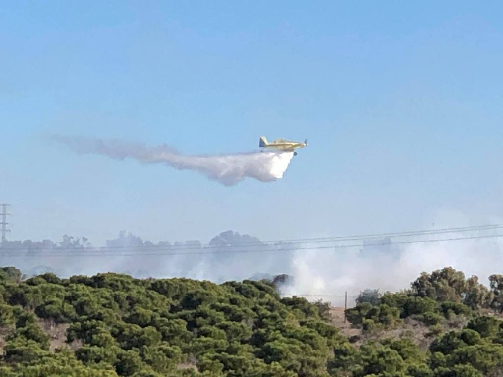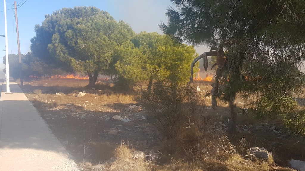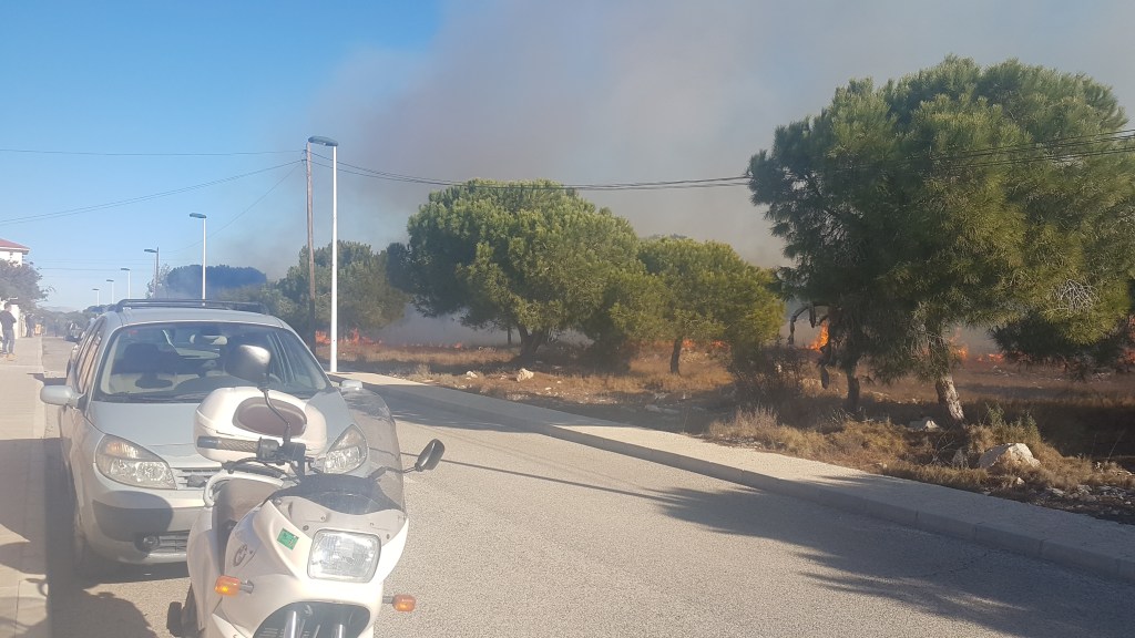 Det handlar om några hundra meter från oss, och som man ser på bilderna så ligger vinden inte på detta hållet. Vi känner svag röklukt, men ytterst svag. Man tycks vara mycket effektiva med släckningen så vi hoppas allt går bra. Området som brinner har inga hus, bara torrt gräs och buskar. Och våra promenadvägar… // Jeanette