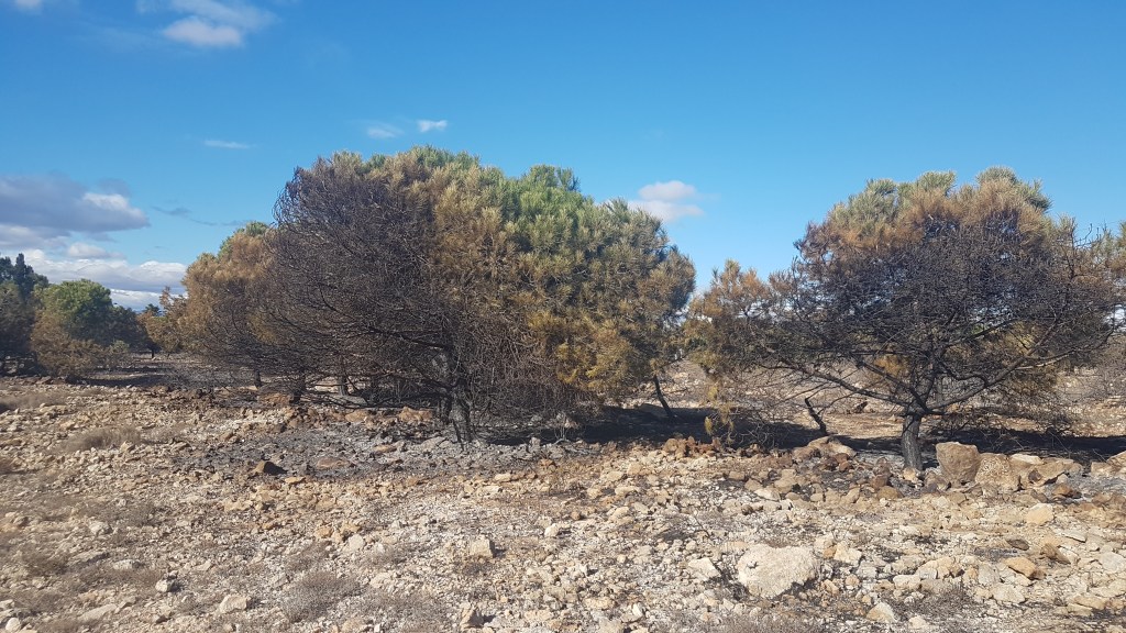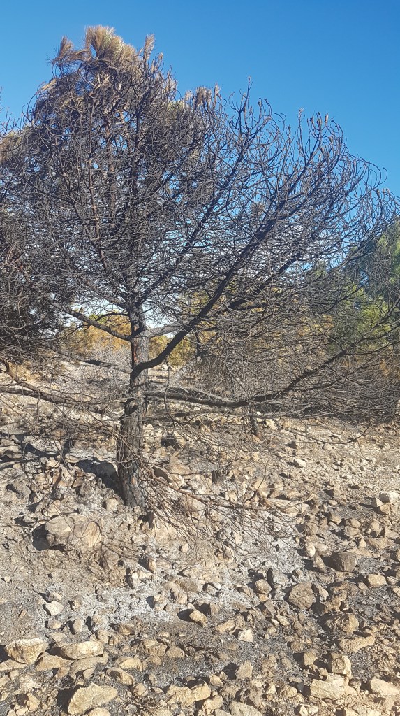 Branden som härjade här dagen innan nyårsafton släckte man ganska fort. Det visade sig vara ganska lite gräs och buskar som hade brunnit, många av pinjeträden klarade sig helskinnade genom lågorna. Det var heller inget jättestort område som tur var. Vi gick en sväng där igår och kollade, men naturen bestod från början mestadels av sten. Det som brann var egentligen mest gräs.