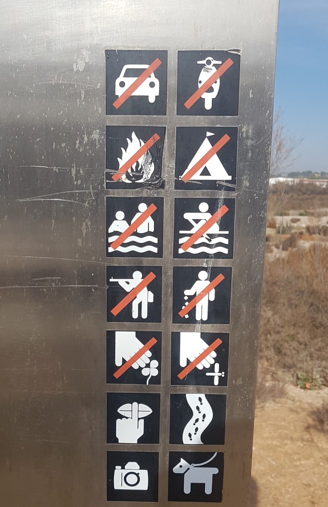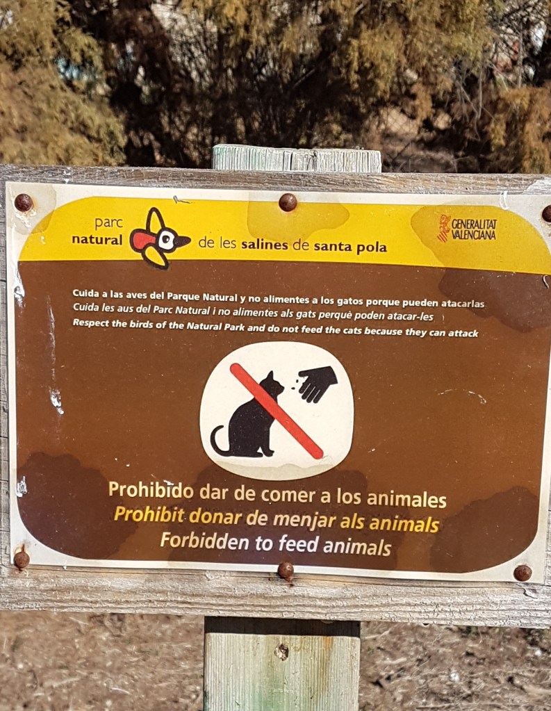 Man får heller inte mata dessa djur, skyltarna står ganska tätt på ena sidan sjön. Detta är en naturpark, och man ska respektera fåglarna och inte mata katterna, för då kan de anfalla… enligt skylten. Just denna katten såg ganska beskedlig ut, tyckte vi. Men man vet aldrig….
