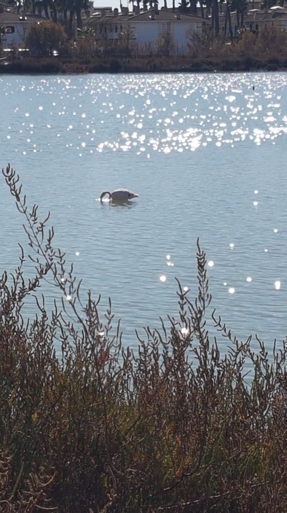 Hur som helst går vi ibland genom just denna parken för att komma ner till stan, och för att slippa gå utmed den trafikerade vägen. Jag försökte även fota en flamingo, som var ovanligt nära kanten. Men det är inte helt lätt och man ser knappt att den är ljusrosa på bilden, tyvärr.