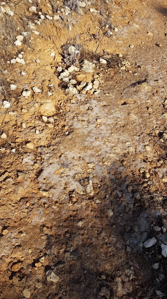 Just nu är det ganska stora temperaturskillnader här från natt till dag. Ett par dagar nu har det legat ett tunt lager is på bordet på morgonen, och vi såg även lite isbeläggning på stenarna på morgonpromenaden bakom campingen. Ser även grannens bil som är täckt av frost just nu. Men mitt på dagen skiner solen och det blir riktigt varmt. Även om lufttemperaturen inte är så hög ännu, är det ändå varmt invid väggen (eller husbilen snarare).