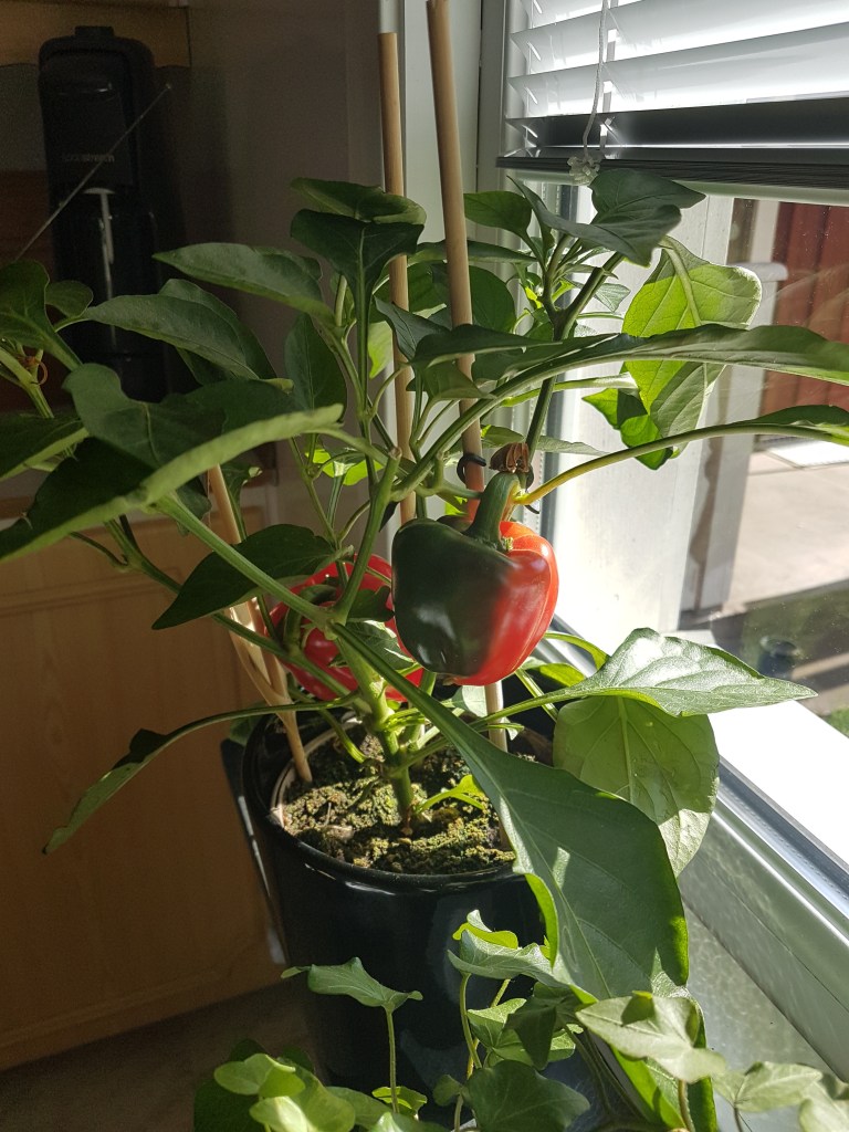 Jag gillar blommor, men har ännu inte hunnit skaffa särskilt många. Två amplar och några mindre blommor att plantera i krukor utomhus. Jag hittade en paprika som nu pryder köksfönstret, och vi har redan skördat två av dessa fina grönsaker. Två kvar på plantan och jag hoppas den ger fler framöver, då just paprika är något vi äter i parti och minut.