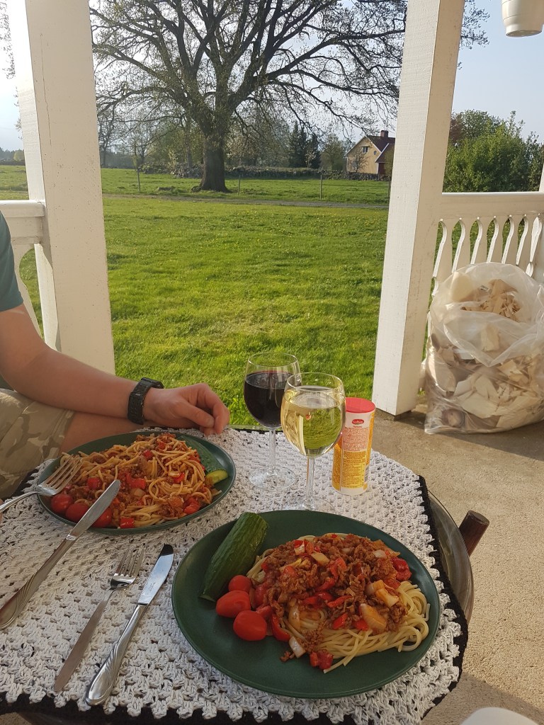 Eftersom det inte har regnat vidare hos oss än så länge, passade vi på att tända grillen även i kväll. Så en middag på altanen blev det, medan vi tittade på regnmolnen som dragit förbi utan att för den skull släppa vatten på oss. Kanske hade vi blivit blöta om vi åkt härifrån, kanske inte. Hur som helst har vi det bra där vi är just nu. // Jeanette