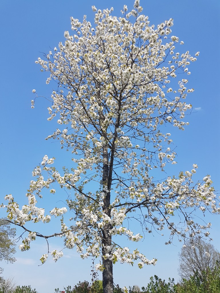 Det är en ganska stor trädgård till huset, och det finns en hel del träd. Vi har även en syrenhäck utmed vägen, vilken jag gissar ger lila blommor så småningom. Träden blommar även de för fullt, och gissningsvis är det körsbärsträd. Ett antal av dessa står lite här och där, och det ska bli spännande att se om de ger frukt. Och om de överhuvudtaget är fruktträd… Hur som helst är de väldigt fina att titta på just nu.