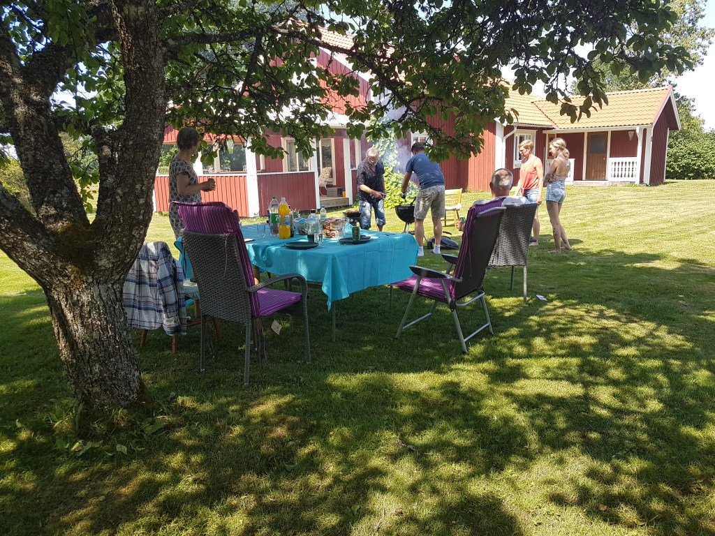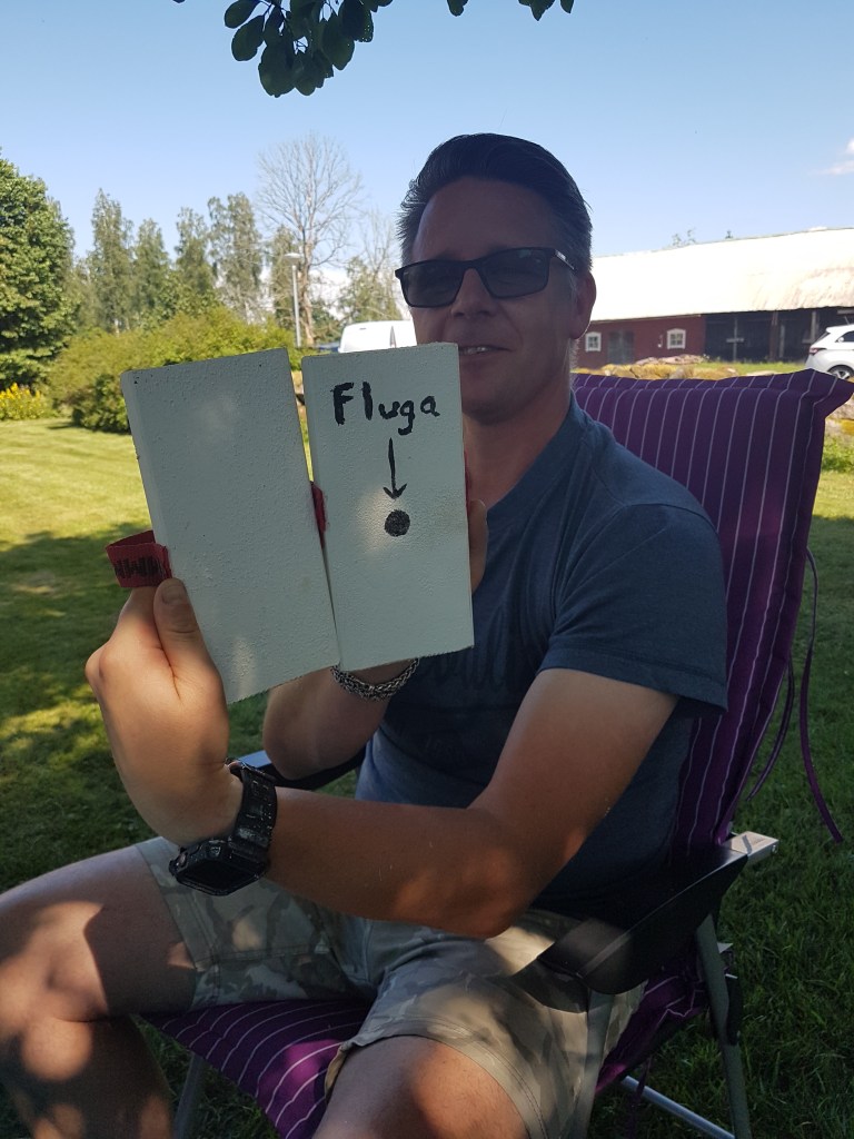 Det var för varmt att sitta på altanen så vi bar helt sonika ut bord och stolar under ett träd istället. Alla var tappra och höll god min, men jag är ganska säker på att fler än jag retade sig på fluginvasionen… Vi fick oss ett gott skratt i alla fall, när Dan öppnade sin födelsedagspresent: En hemmagjord flugsmäcka i trä 😂