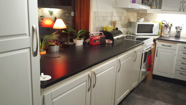 Vidare renoverade vi köket lite till senare, då vi bytte bänkskivor, målade om luckorna och bytte handtagen, bytte fläkt och kyl, frys och diskmaskin. Även badrummet fick sig ytterligare lite annan färg, när vi senare målade om det i svart. Vi bytte även handfatet och spegeln. Tyvärr inga bilder på det. Vi bodde i detta huset i 11 år innan vi sålde det 2016.