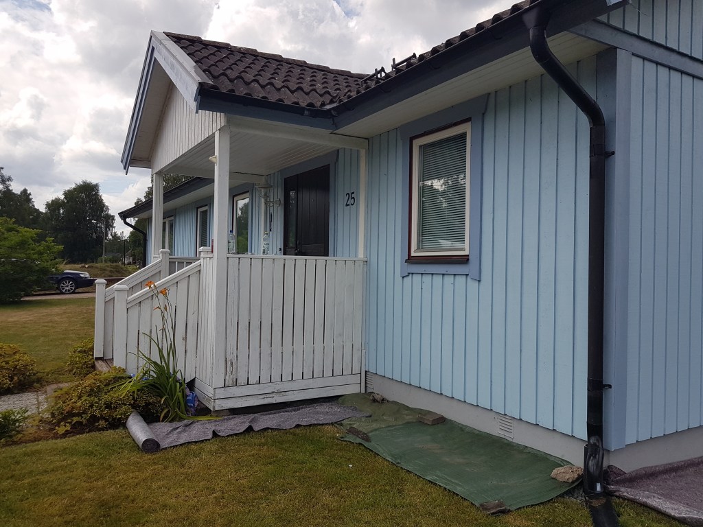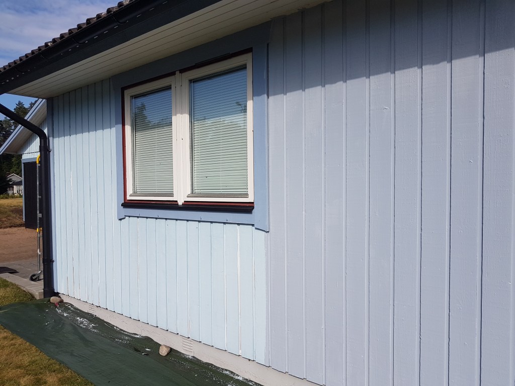 Firma Dan Ritzén har nu i värsta värmen jobbat för fullt med en villa till. Målning utvändigt, fasad och vita detaljer som veranda och fönster bland annat. Lite svettigt har det varit mellan varven, då alla sidor av huset inte ville befinna sig i skugga hela tiden…