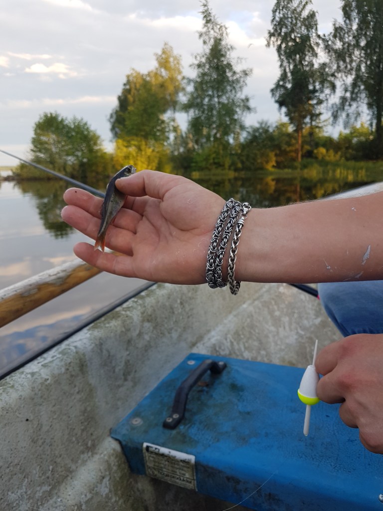Nej, veckan har även erbjudit bad och fiske i sjön vi bor intill. Två stycken mini-abborrar lyckades vi dra upp på mete, dock fick de simma tillbaka igen. Båten på bilden är inte vår, vi lånade den av hyresvärden. Från huset har vi ca 300 m ner till sjön Flåren.