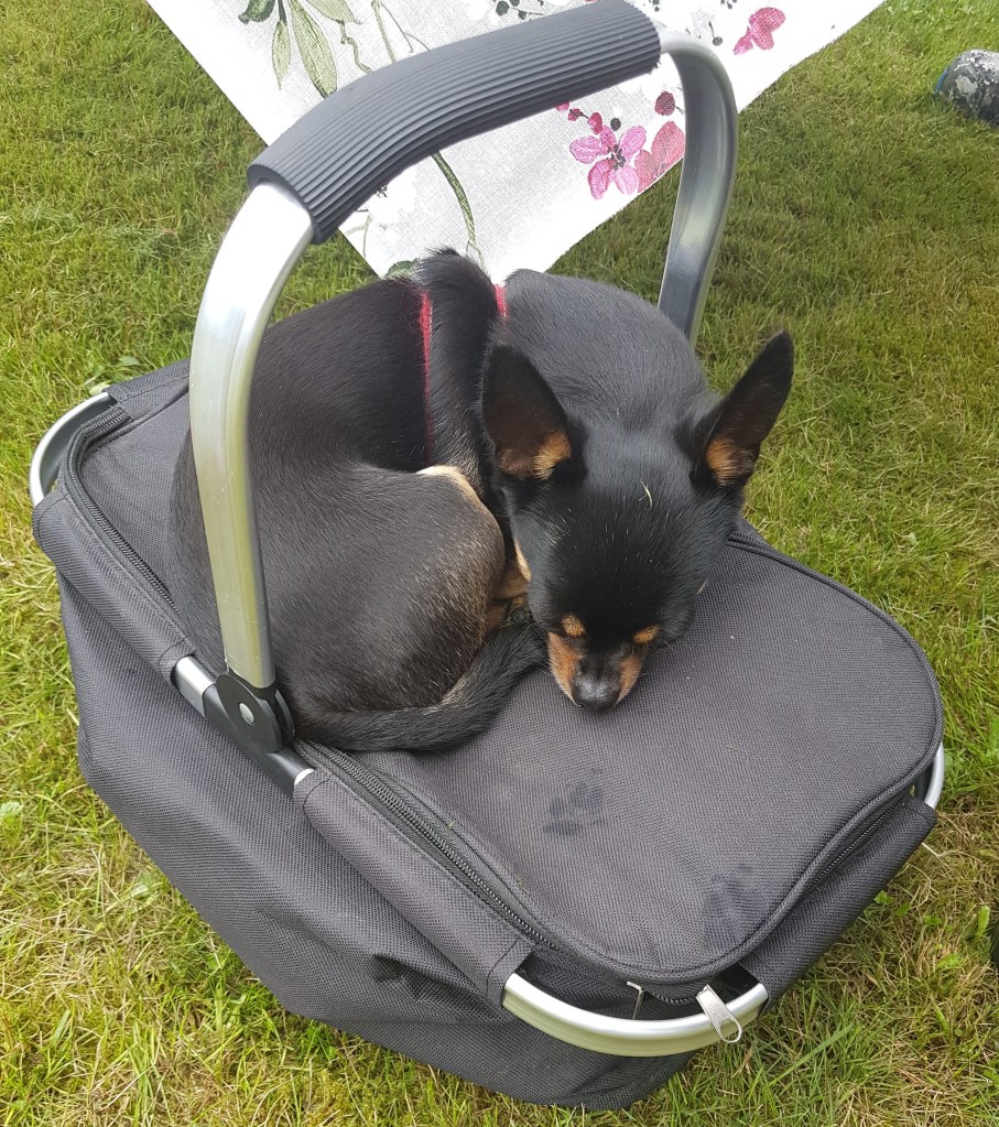 Chillie har varit med på jobb hela veckan och lekt med kundens lilla hanhund. Även hon tyckte det var lite väl varmt vissa dagar och tog sig en liten lur på kylväskan. Hon har även frivilligt hoppat i sjön flera gånger, dock vill hon inte simma.
