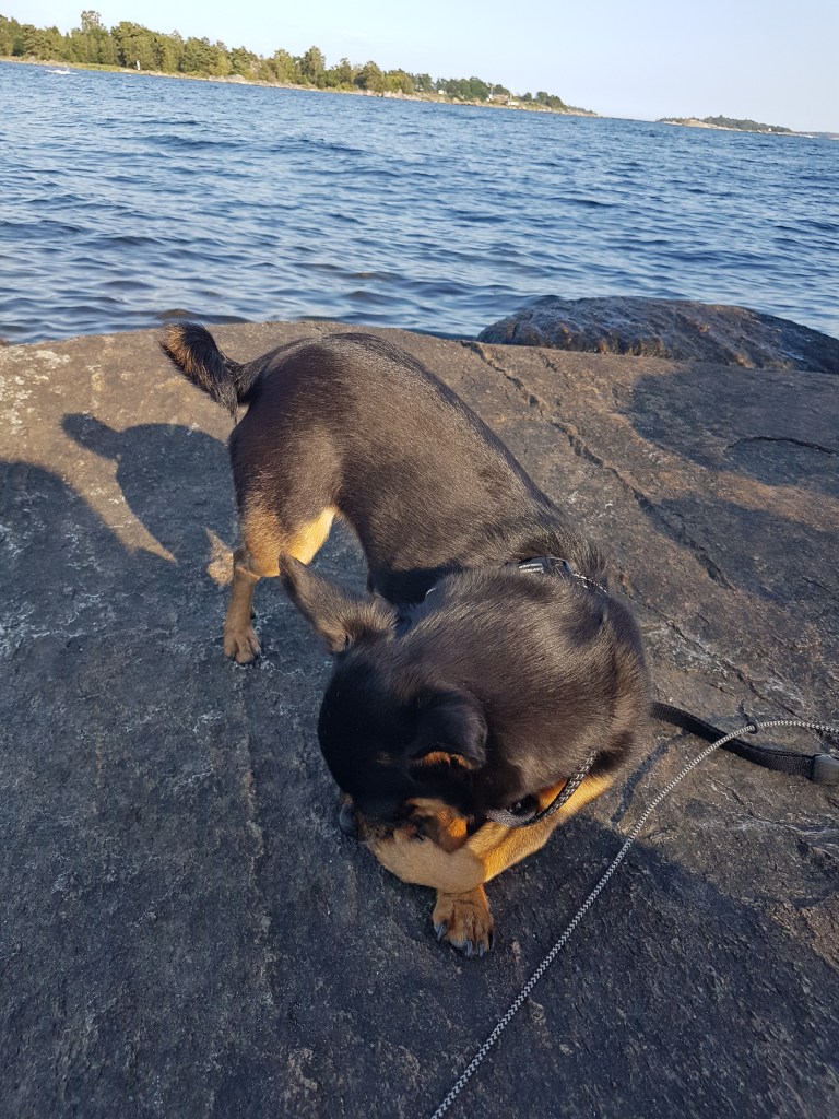 Ställplatsen hade nu blivit en liten camping med drygt 20 platser, kanske 22. Fullt utrustat servicehus med allt man kan tänkas behöva. Vi nyttjade endast latrintömningen… Det fanns även en jättefin badstrand några meter bort från vår plats, där Chillie testade badtemperaturen. Hon tyckte det var varmare än i havet…