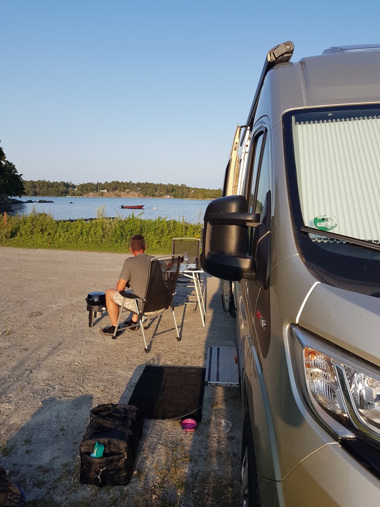 Istället passerade vi campingen som var fullbokad och fortsatte utmed vattnet tills vi hittade en liten båtklubb där det inte var parkeringsförbud. Några andra mindre husbilar fanns på platsen och vi körde in och parkerade ihop med dem. Vi packade en korg med filt, räkor och vin och tog oss en tur ut på klipporna i solskenet.