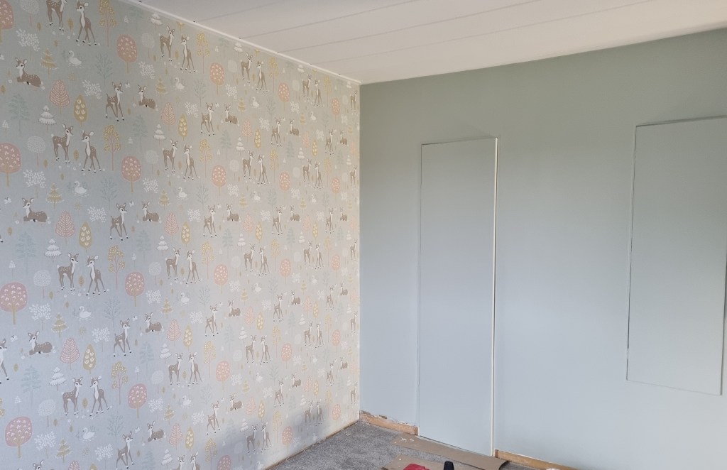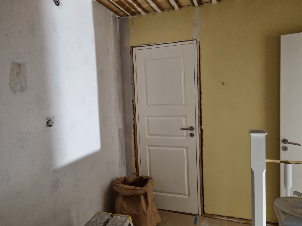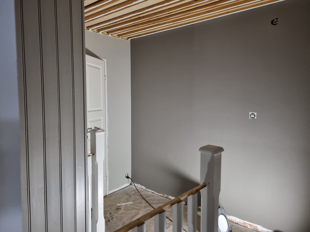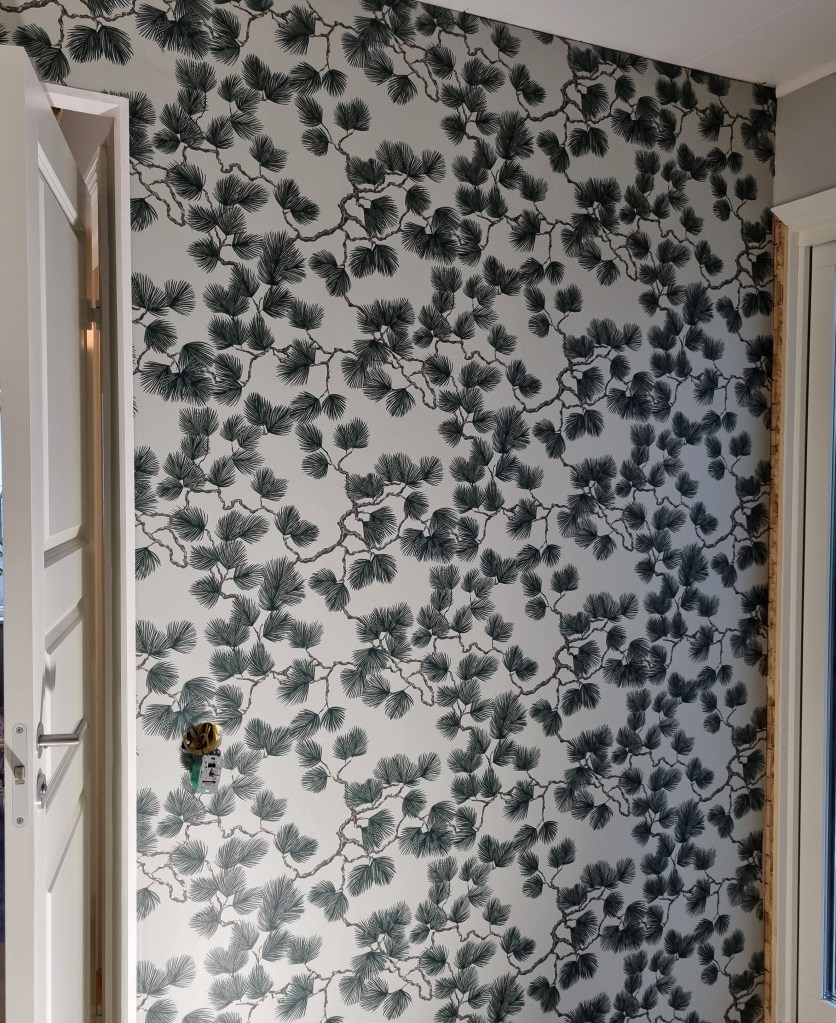 En villa som får en hel-makeover kan man säga. Kunden har nyss köpt den och ville göra om 2 sovrum, ett vardagsrum, en vägg i köket, hall uppe och nere och panelen i trappan. Mycket spacklande och slipande blev det. Sen färg och tapeter. Här kommer lite smakprov på delar av arbetet. Kunden har valt mörk och ljus färg mot varandra, samt tapet som fondvägg.