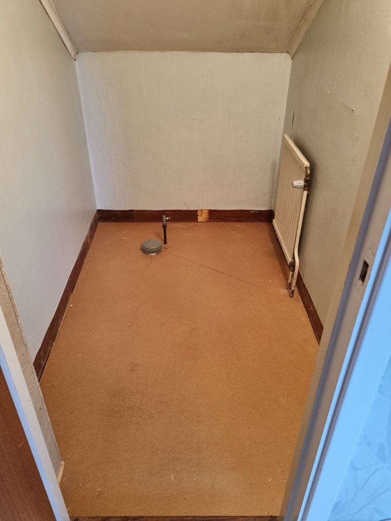 Bilden visar vår lilla toalett på övervåningen. Som synes inte renoverad på många år. Men nu ska det äntligen ske, eftersom avloppet började läcka för flera månader sedan. Hyresvärden bytte rör och slängde ut både handfat och toastol på balkongen. Rev upp golvet som nu är nytt och där ska nu in en ny matta. Eftersom det bor just målare i huset så blir det vi som får fixa väggarna och taket. Den gamla plastmattan på väggarna ska bort och istället blir det väv där som vi sedan målar. Det blir säkert bra när det blir färdigt, får återkomma med det.