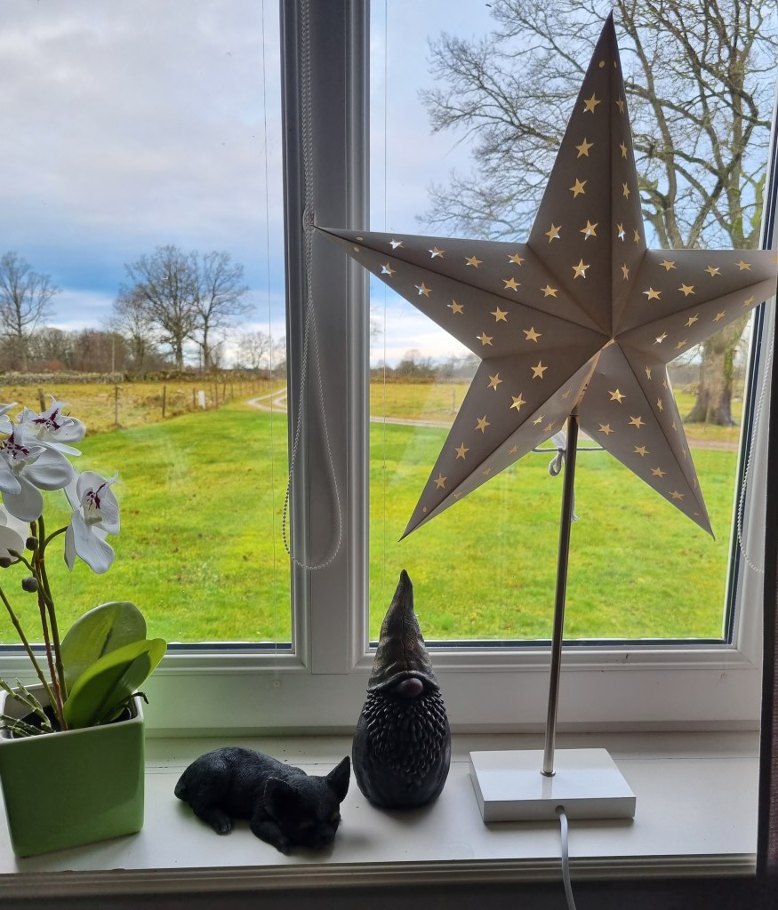 Jag rotade igenom kartongen jag skrev om i förra inlägget. Den som det stod JUL på… Hittade mina stjärnor till fönstren och några adventsstakar. Lite porslinstomtar och andra tomtar och en ljusslinga med bollar att hänga på väggen. Vet också att jag har julgardiner, men de passar inte i fönstren i detta huset. Så det får blir ljus i fönstren och möjligen någon duk på borden, inte mycket mer än så. Men vi var på en julbasar i helgen och hittade en söt hemmagjord tomte och en liten hund som passar fint här, som vi köpte av #rostigtochunderbart.