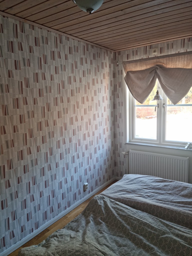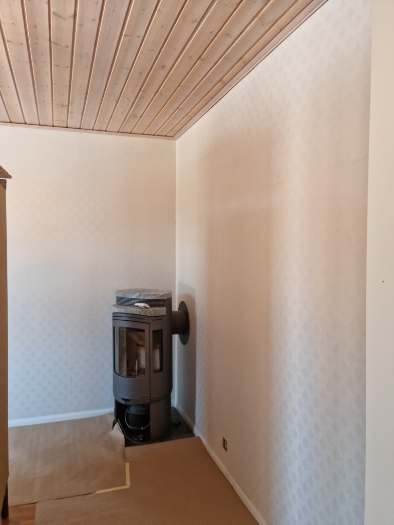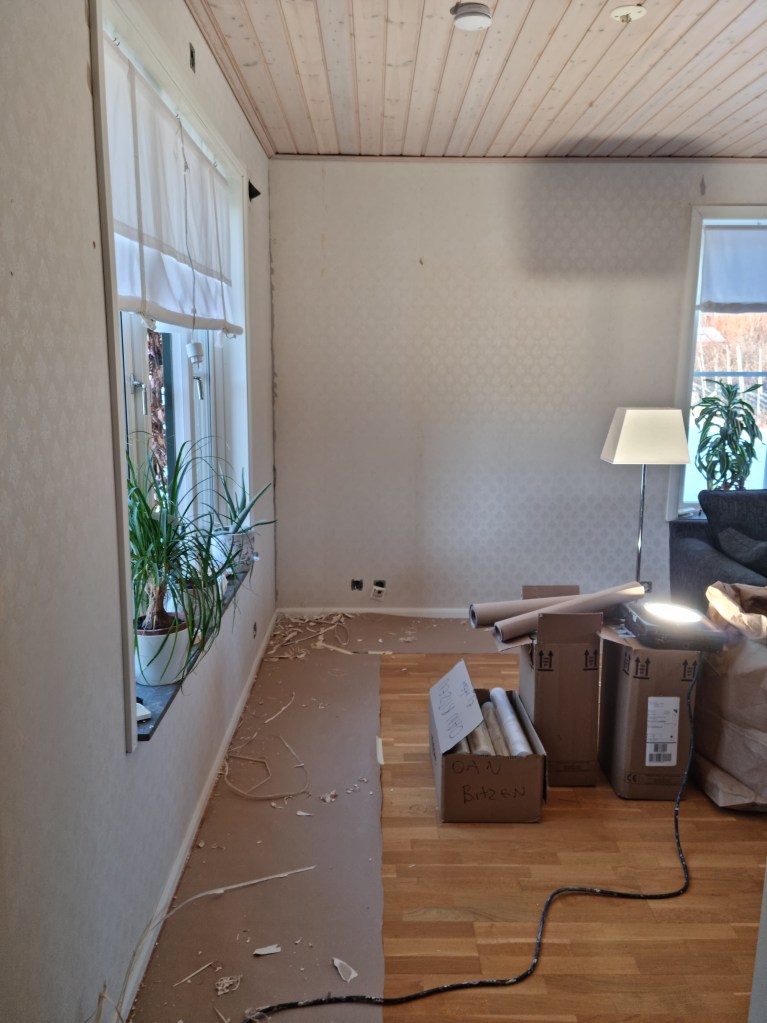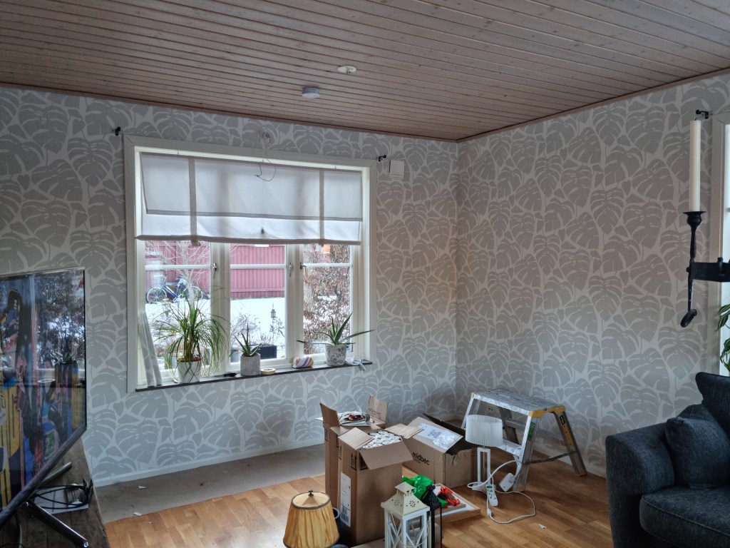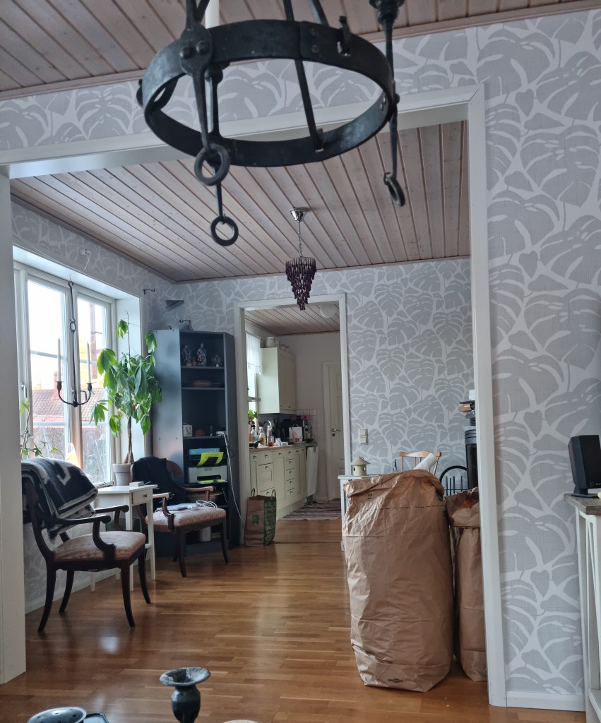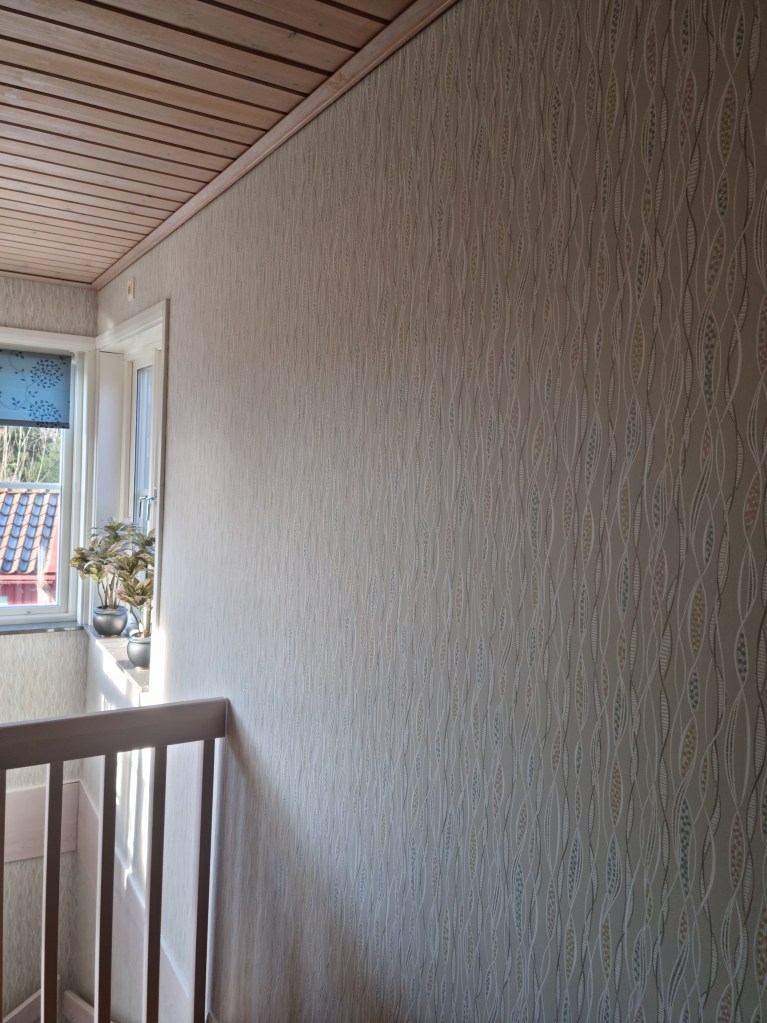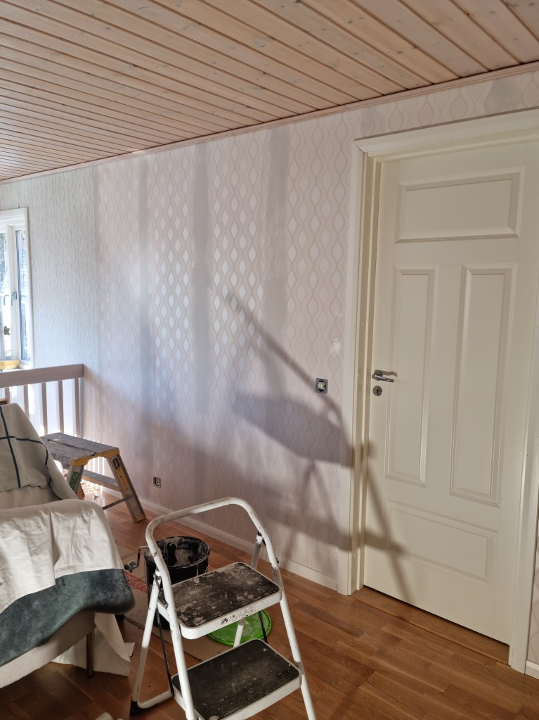 Här kommer lite före och efterbilder på tapetseringen som vi gjort. Vardagsrum, bibliotek, 3 sovrum, hall nere, trappa och allrum på övervåningen, samt en fondvägg i köket. // Jeanette