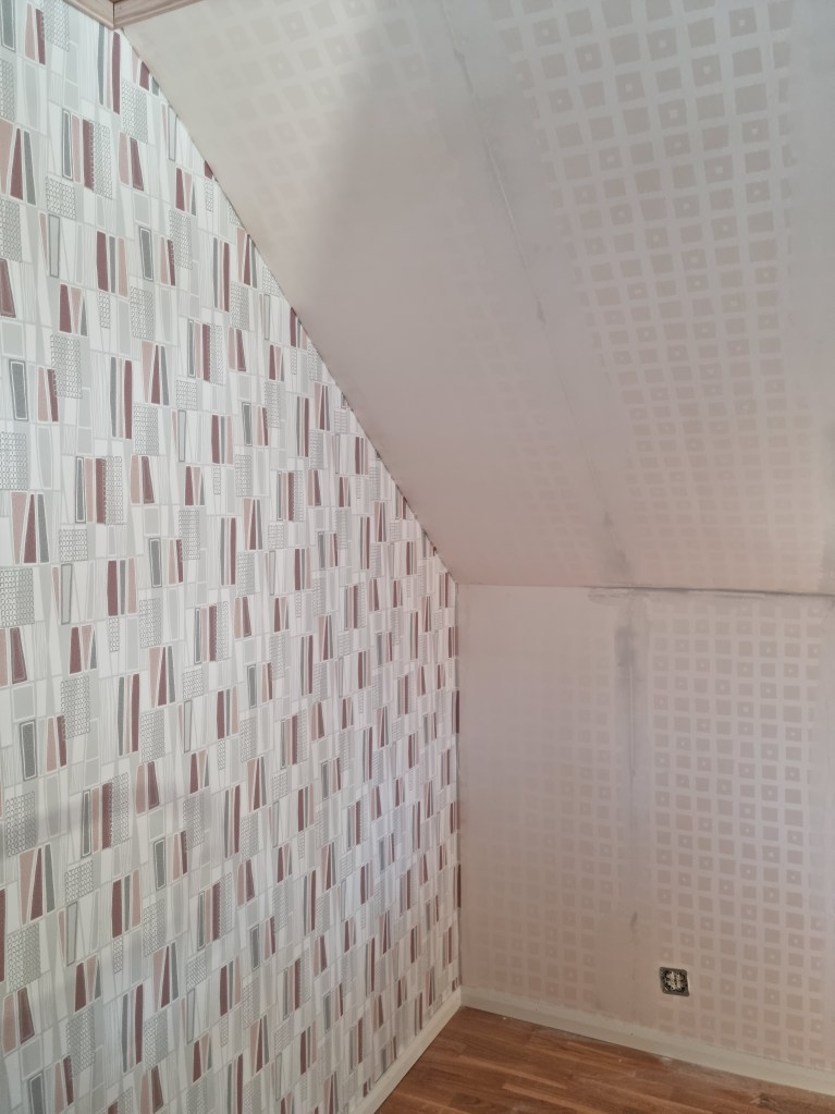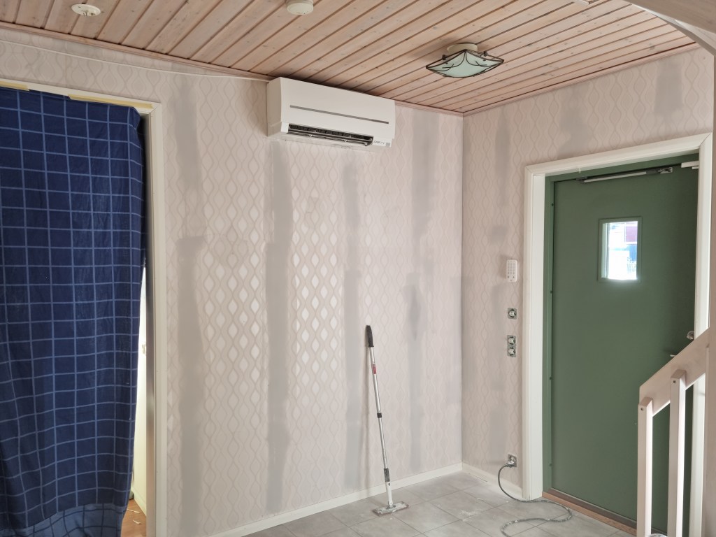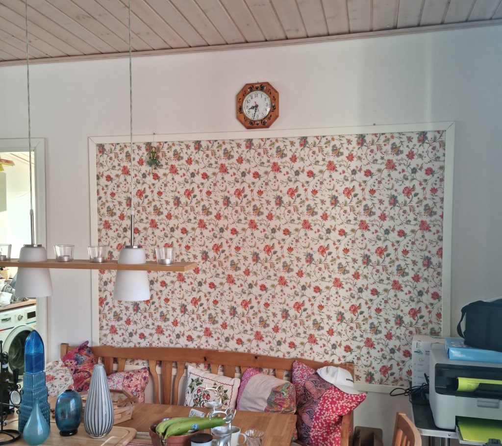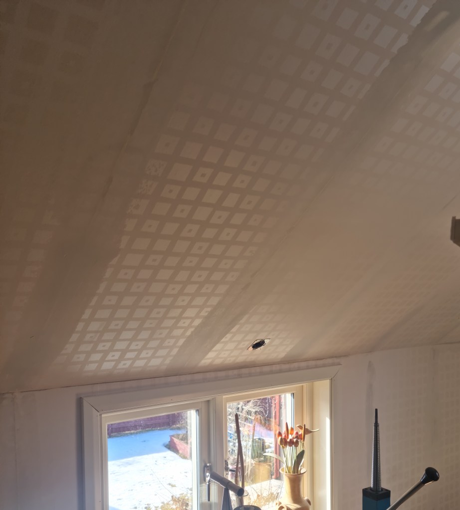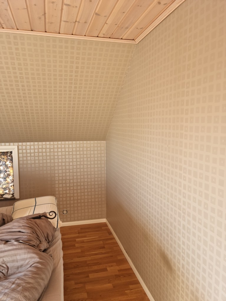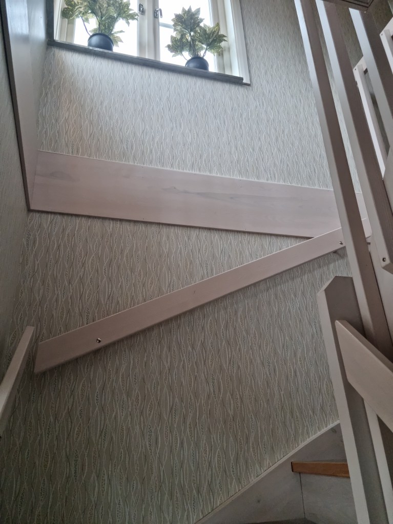 Här kommer lite före och efterbilder på tapetseringen som vi gjort. Vardagsrum, bibliotek, 3 sovrum, hall nere, trappa och allrum på övervåningen, samt en fondvägg i köket. // Jeanette