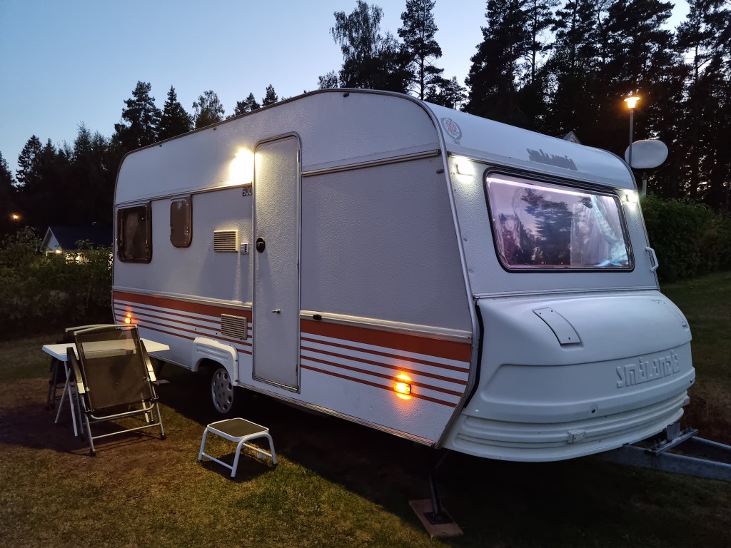 Vi spelade golf, åkte iväg på olika jobb. Mådde gott i bilen, den fungerade utmärkt. Och så dök möjligheten upp för oss att köpa en gammal husvagn ståendes på campingen där vi tidigare bott. Bara sådär…