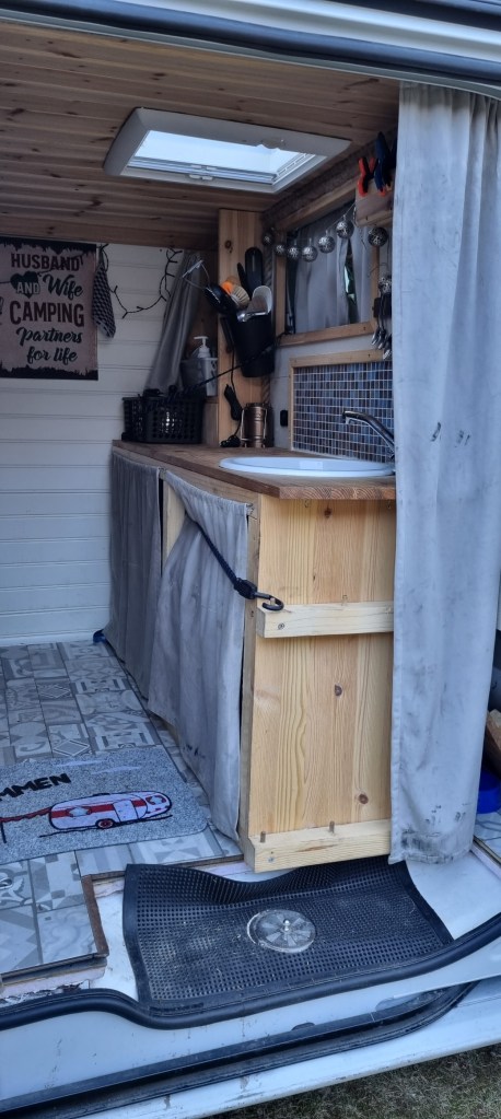 Dessa minivans eller campervans byggs på befintliga skåpbilar. Det är alltså ett hemmabygge. Många använder just WW Crafter, sådan som vår firmabil, eller tex. Mercedes sprinter till att bygga egna campervans. Dessa är naturligtvis större och har bättre plats inuti. Vår Opel har inte riktigt ståhöjd och det får inte plats mycket i den. Men som övernattningsbil tror vi att den kommer fungera utmärkt. Och framför allt, den får plats överallt.