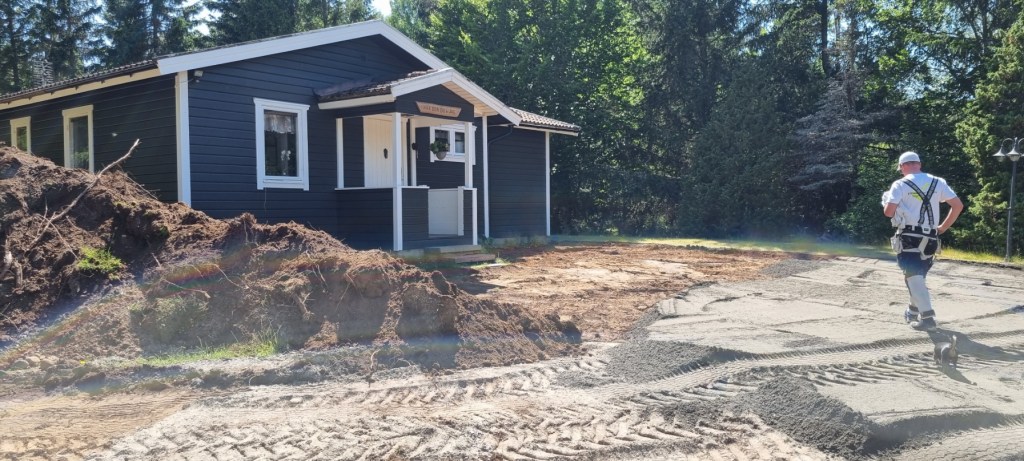 Det var ojämt och gräs fram till verkstaden, vilket inte höll för alla dessa transporter. Så nu har vi en fin yta att köra på och bra plan att parkera husvagn och släp och bilar på, utan att det blir en gyttjepöl när det regnar.