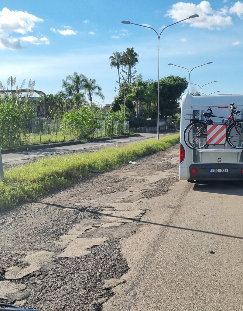 Att ta sig fram till en camping eller ställplats är utmanande, då vi måste in i någon by med dessa hemska vägar. Även inne på campingarna är det gropar och bulor och ojämt underlag.