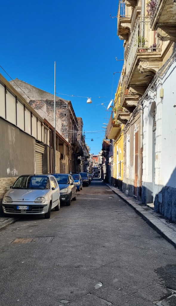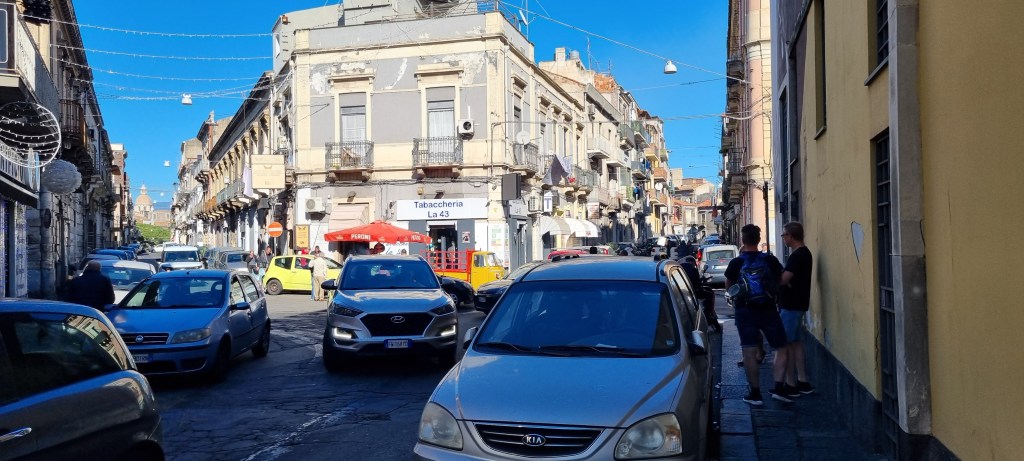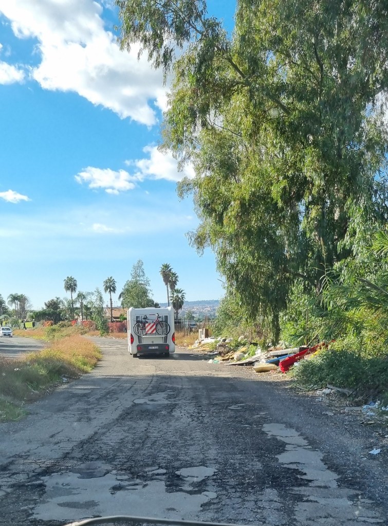 Här blev vi väckta av tupparna som gick fritt utanför bilarna, hundar som skällde och vidare trafikljud och flygplatsljud. På parkeringen låg det fullt med krossat glas, faktiskt över det hela. Varmvatten fanns inte, men det kostade 15 Euro ändå. Vi besökte Catania till fots och hittade både drinkar och middag i stan, men alla ljud och all trafik blev för mycket. Även på denna ställplatsen blev vi inlåsta på natten. Det var lite skumt folk i omlopp kändes det som. Engelska är heller inget språk man talar här, det är otroligt svårt att göra sig förstådd. Efter 2 nätter gav vi upp.