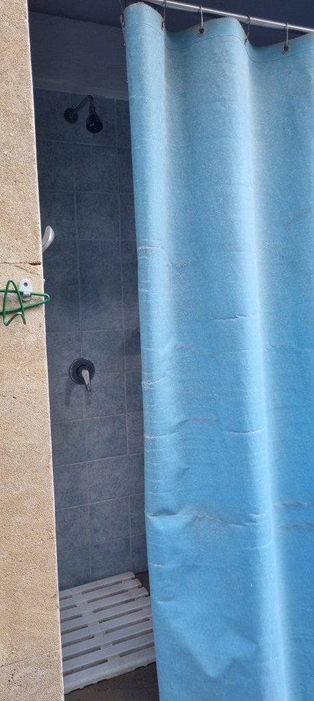 På camping eller ställplats betalar man för att få stå tryggt och samtidigt använda de faciliteter som erbjuds. Toa, dusch, sopcontainer, el, tömning av toa och gråvatten, påfyllning av vatten. Vi använder ingen el, men just på detta stället erbjuder man 4 Ah säkring. Vet inte vad en kan driva på det riktigt… Men toaletter och duschar ser fräscha ut, dock inget vi nyttjar heller. Toan erbjuder ingen sits och heller inget toapapper. Det tar man med själv, och här ska det dessutom slängas i papperskorgen som står jämte toan. Mysigt, eller hur? Duscha får man göra bakom ett drapperi, det är ju trevligt. Hade varit värre om det varit helt öppet…