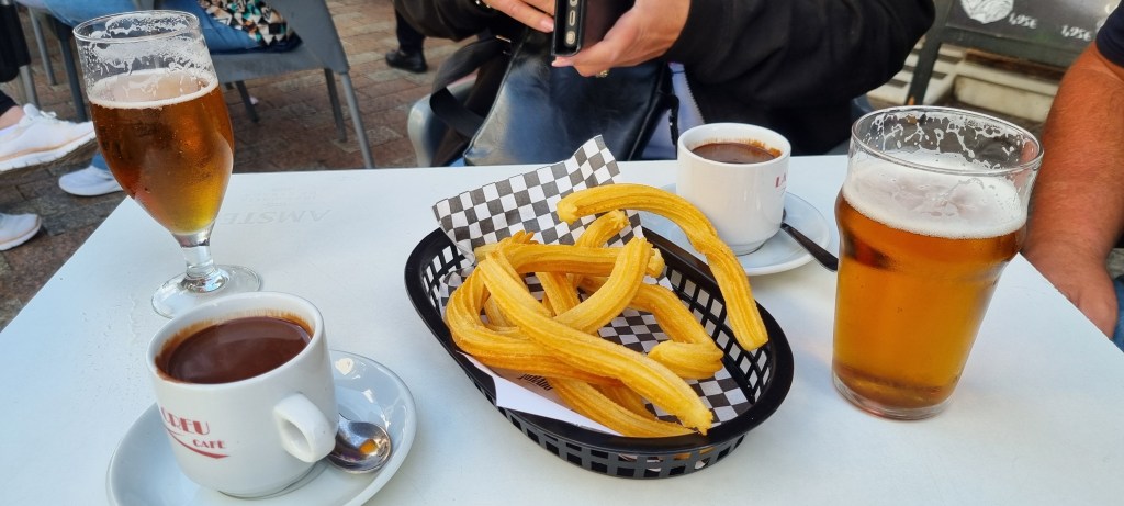 Vi har testat att fika och äta ute, dricka Aperol Spritz, Mojito och öl, på flera olika ställen med våra nyfunna vänner Odd och Lenica. Hittat en favorit redan, Churros doppade i choklad. Rekommenderas verkligen, de var supergoda. Man kunde se skidpremiären på storbilds-TV på krogen, eller varför inte kela med lite duvor… Ikväll blir det paella i piscinan på campingen, det var visst kareoke där ikväll. Måste ju festa lite med….//Jeanette